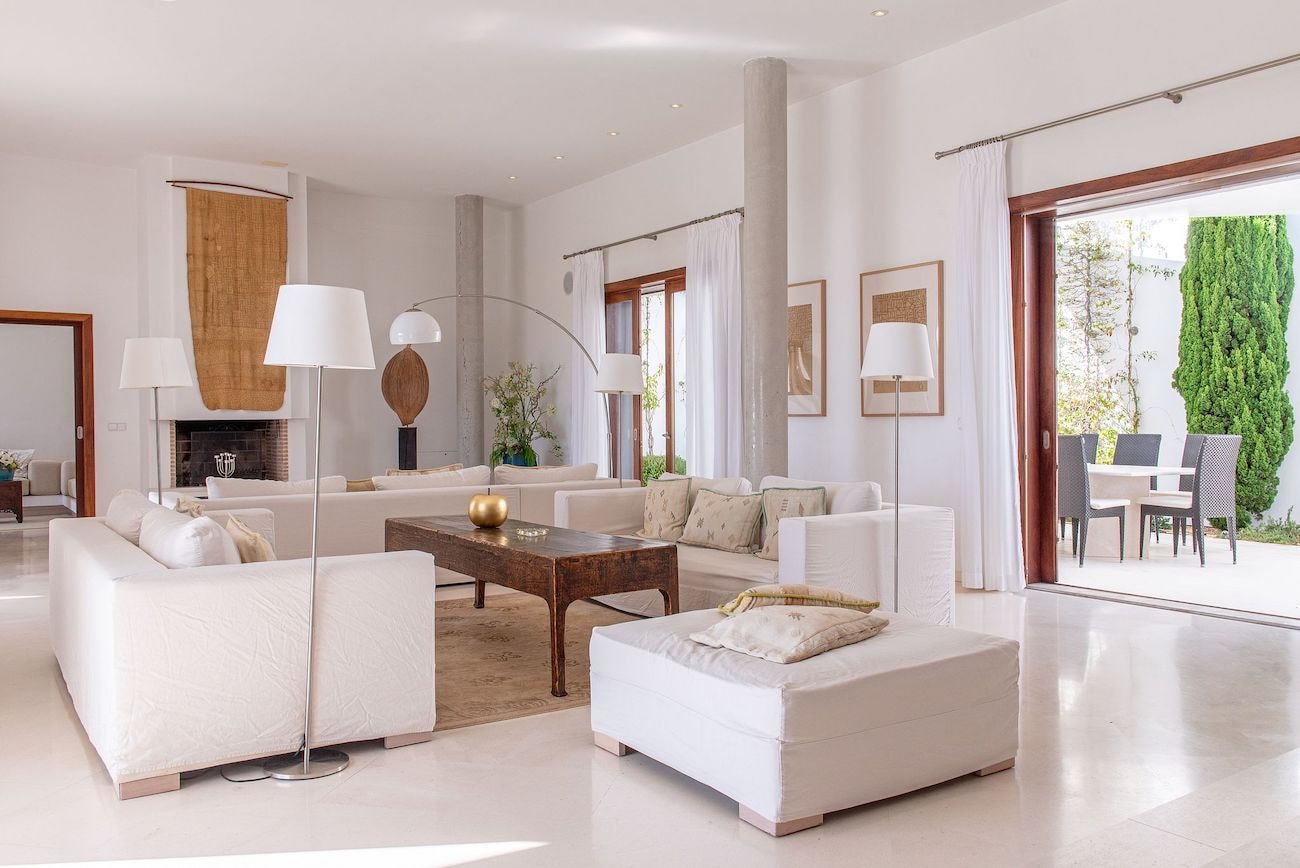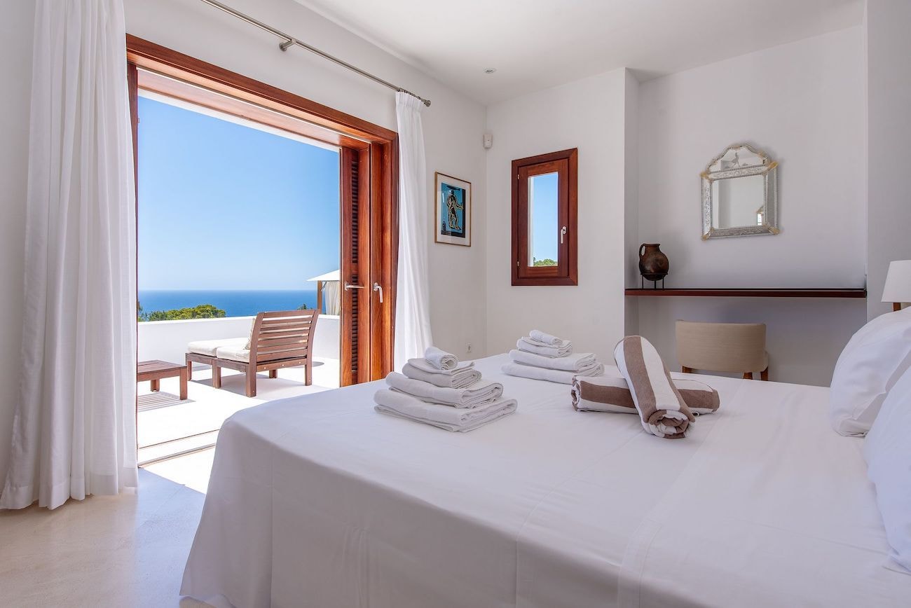 Villa Alexia greets you with sweeping views across Cala Vadella's sheltered bay, where the Mediterranean stretches endlessly towards the horizon. This substantial property spans 600 square metres, thoughtfully positioned to capture both sea vistas and the gentle valley below. Six bedrooms accommodate larger groups comfortably, while the proximity to one of Ibiza's most family-friendly beaches makes it particularly suited to those travelling with children.