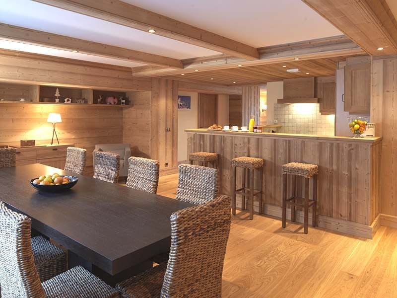 The first floor entrance opens to a practical hall with bench seating and storage for winter gear. A few steps lead down to the dining space, where twelve can gather around the table overlooking the outdoor terrace. The kitchen features a breakfast bar with three stools, four-ring electric hob, full oven, microwave, dishwasher, and washing machine. Around the corner, the sitting room holds two large sofas, four chairs, and entertainment setup including French TV with Freesat UK channels.