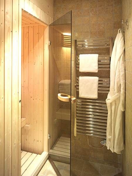 Three bedrooms occupy the upper level. The first offers twin beds, walk-in wardrobe and en-suite shower room. The second provides a double bed with bath, double sinks and ample wardrobe space. The third twin room includes its own bathroom with bath and built-in storage. Downstairs, a two-person sauna with separate shower sits opposite a guest WC. Three more bedrooms complete the layout: a bunk room, a twin, and a double, each with en-suite facilities and wardrobes.