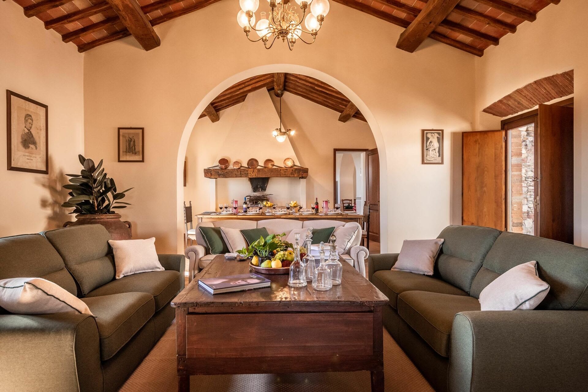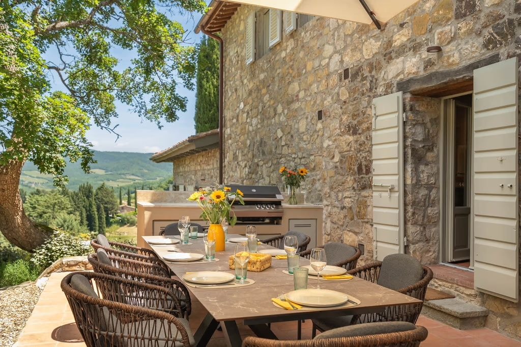 A restored stone farmhouse just a stroll from Radda in Chianti, where Tuscan tradition meets refined comfort. Five bedrooms, private pool, and panoramic views across the rolling hills.