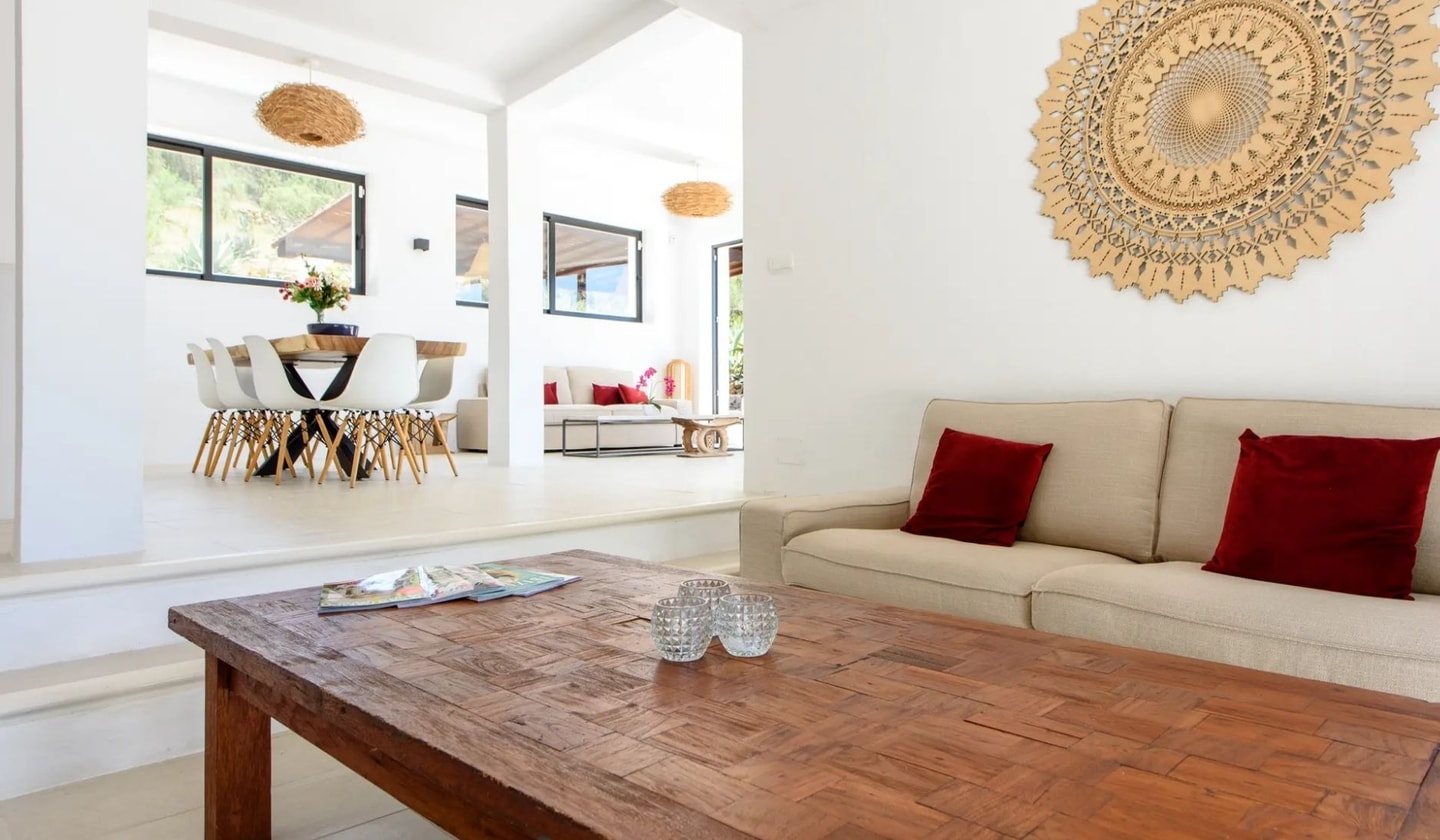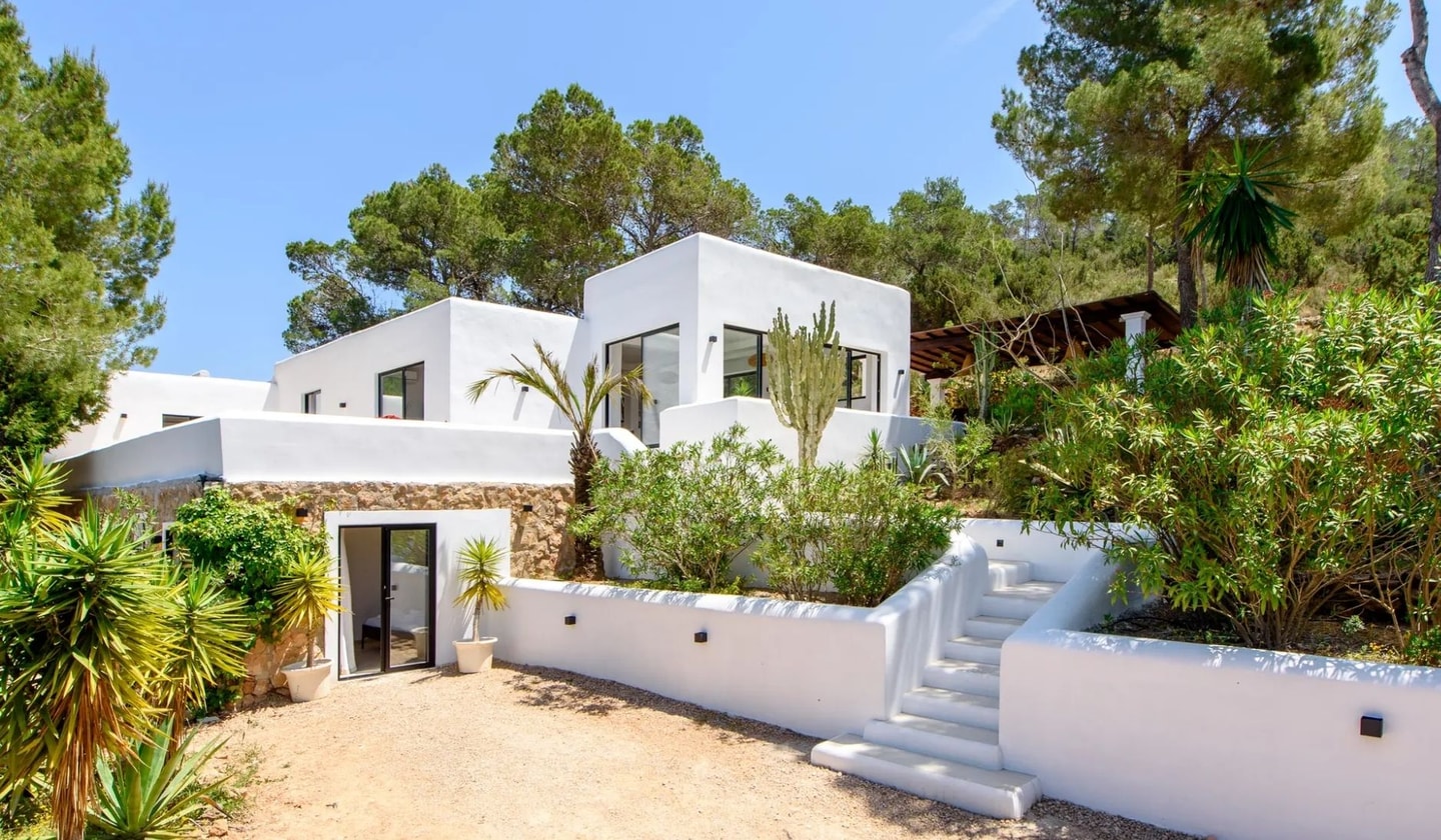 A peaceful hillside escape with mosaic pool and sunset views, just minutes from Ibiza's finest west coast beaches. Five bedrooms blend Asian-inspired design with island comfort.