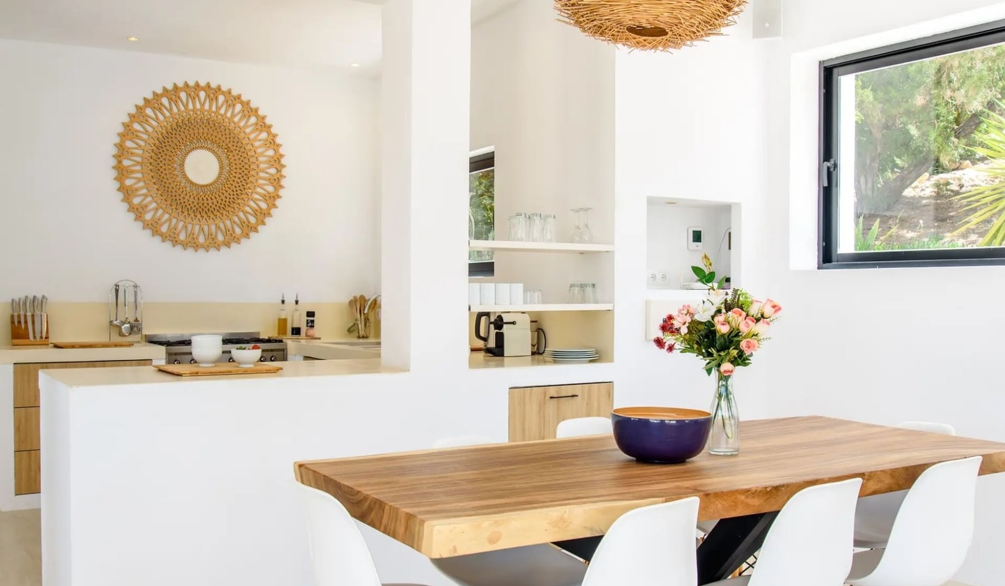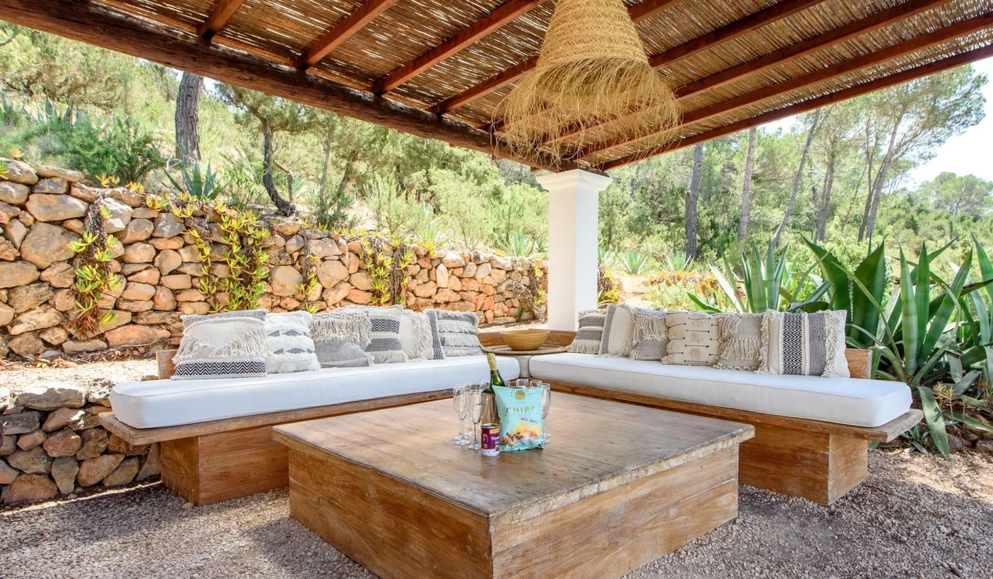 Five bedrooms sleep your group comfortably across four bathrooms. Air conditioning in every bedroom and the living areas keeps everyone cool during warm summer nights. Behind the villa, a covered terrace houses an outdoor kitchen with barbecue, plus another dining table for alfresco meals. The front terrace offers its own large dining setup, perfectly positioned for those famous Ibizan sunsets.