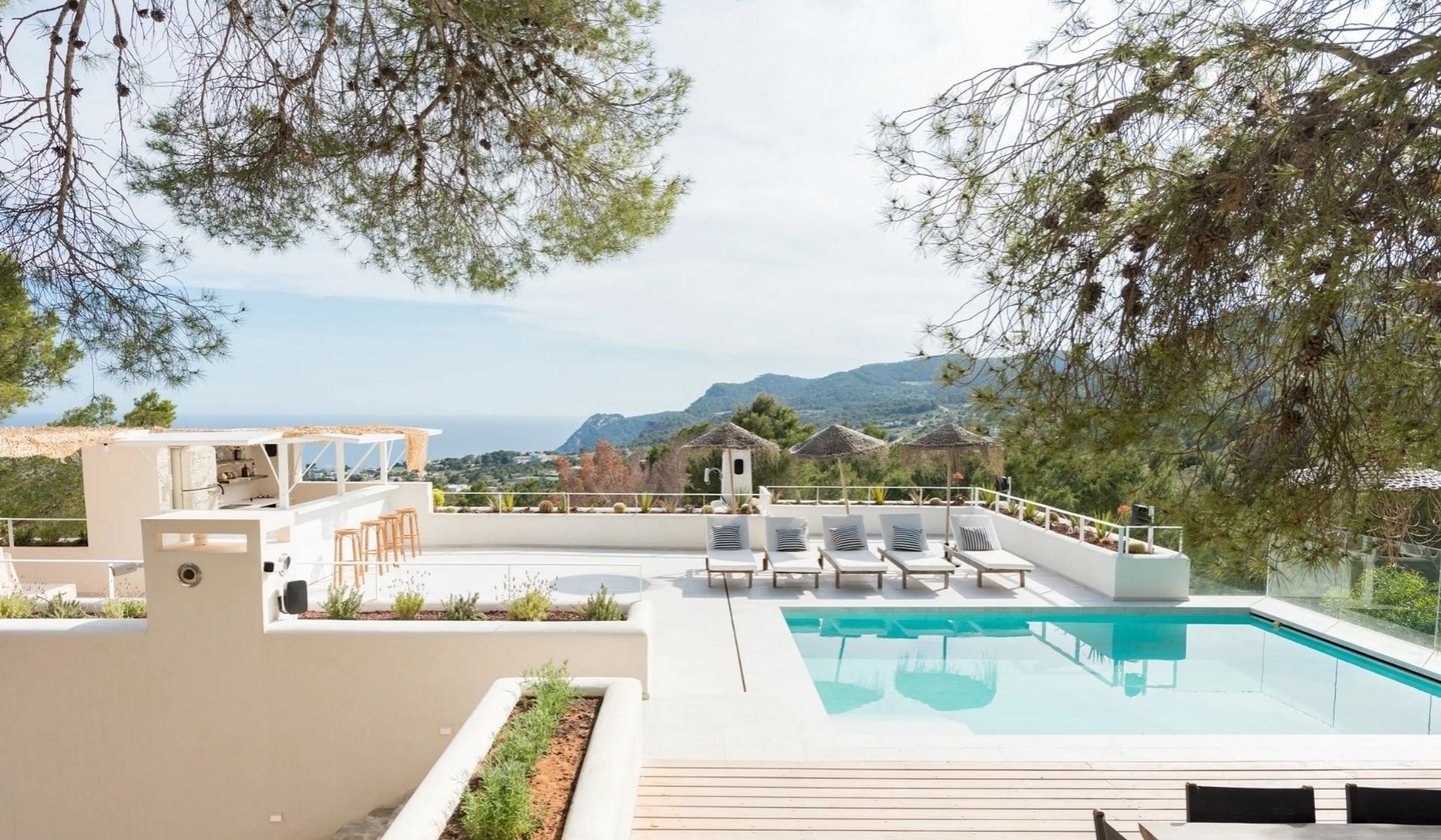 Where dreams become reality, this Es Cubells villa offers six bedrooms, a rooftop chiringuito with pool, and excellent sea views over the bay.
