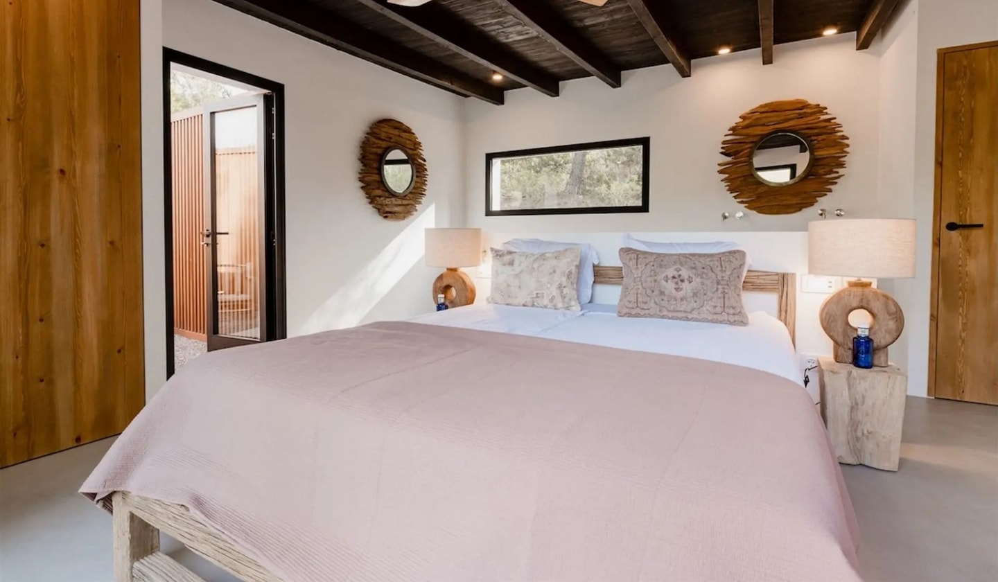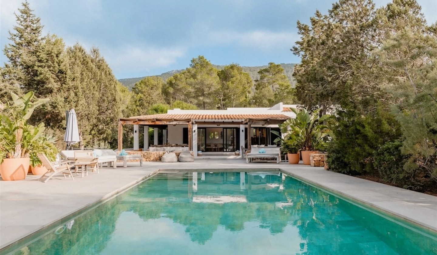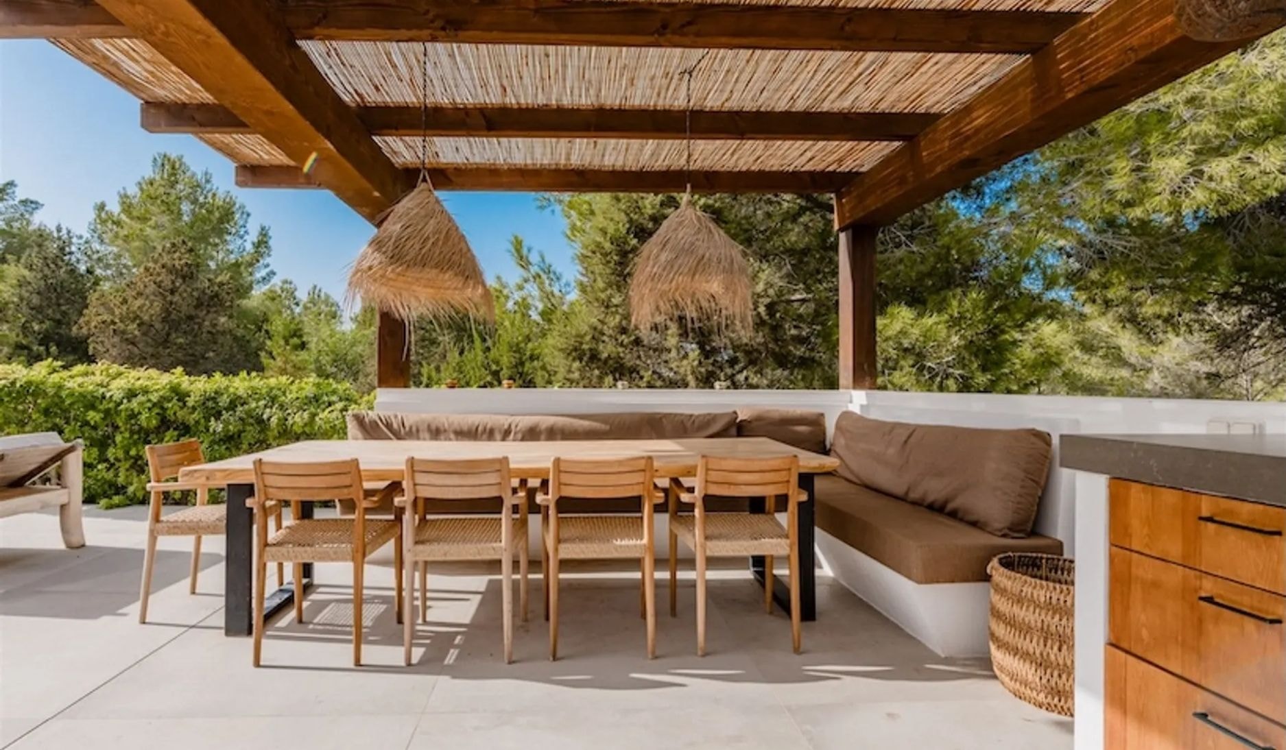 A private hillside retreat near Cala Vadella, where modern Ibiza style meets Balinese design touches. Five bedrooms spread across the main villa and two guest houses offer plenty of space and privacy.