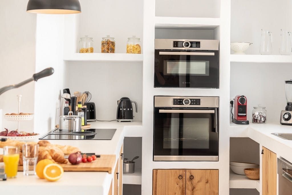 Two vast sliding doors blur the line between interior and terrace, filling living spaces with natural light. The circular tower room invites conversation, with Bowers & Wilkins speakers providing the soundtrack. A semi-open kitchen overlooks the saltwater pool, while the ground floor has two bedrooms with box-spring beds and a shared bathroom featuring a two-person bath. Upstairs, three more bedrooms feature private bathrooms and loggia access, with domotica controls and sensor lighting.