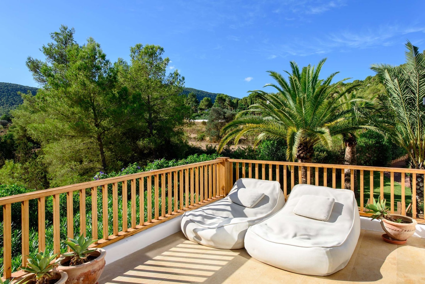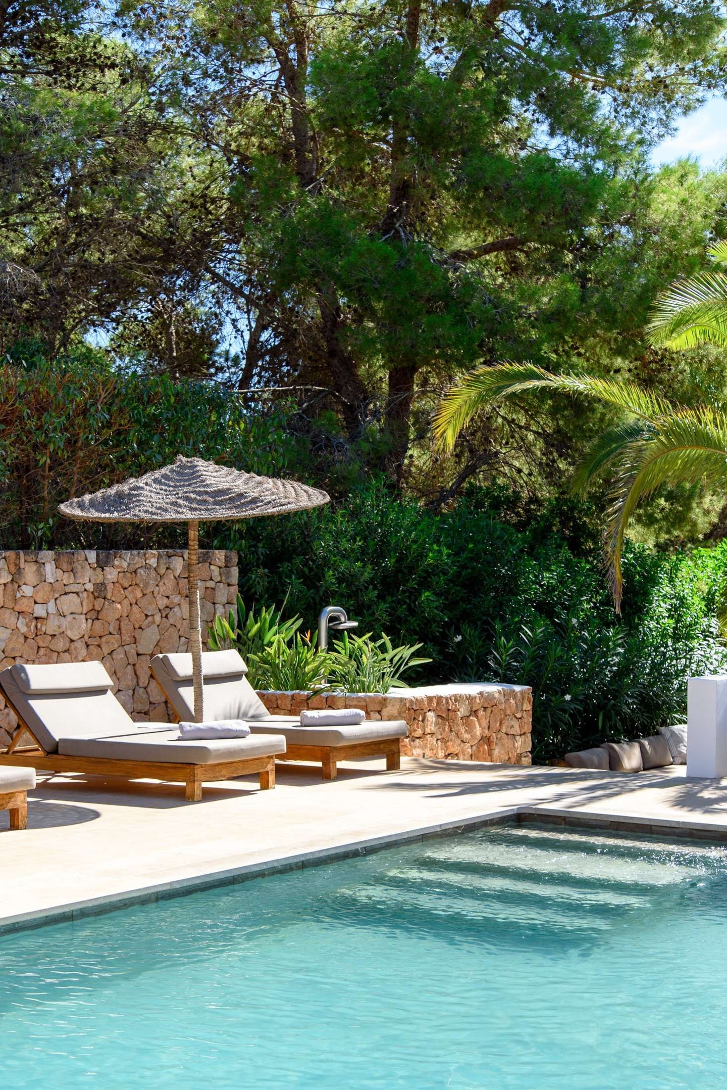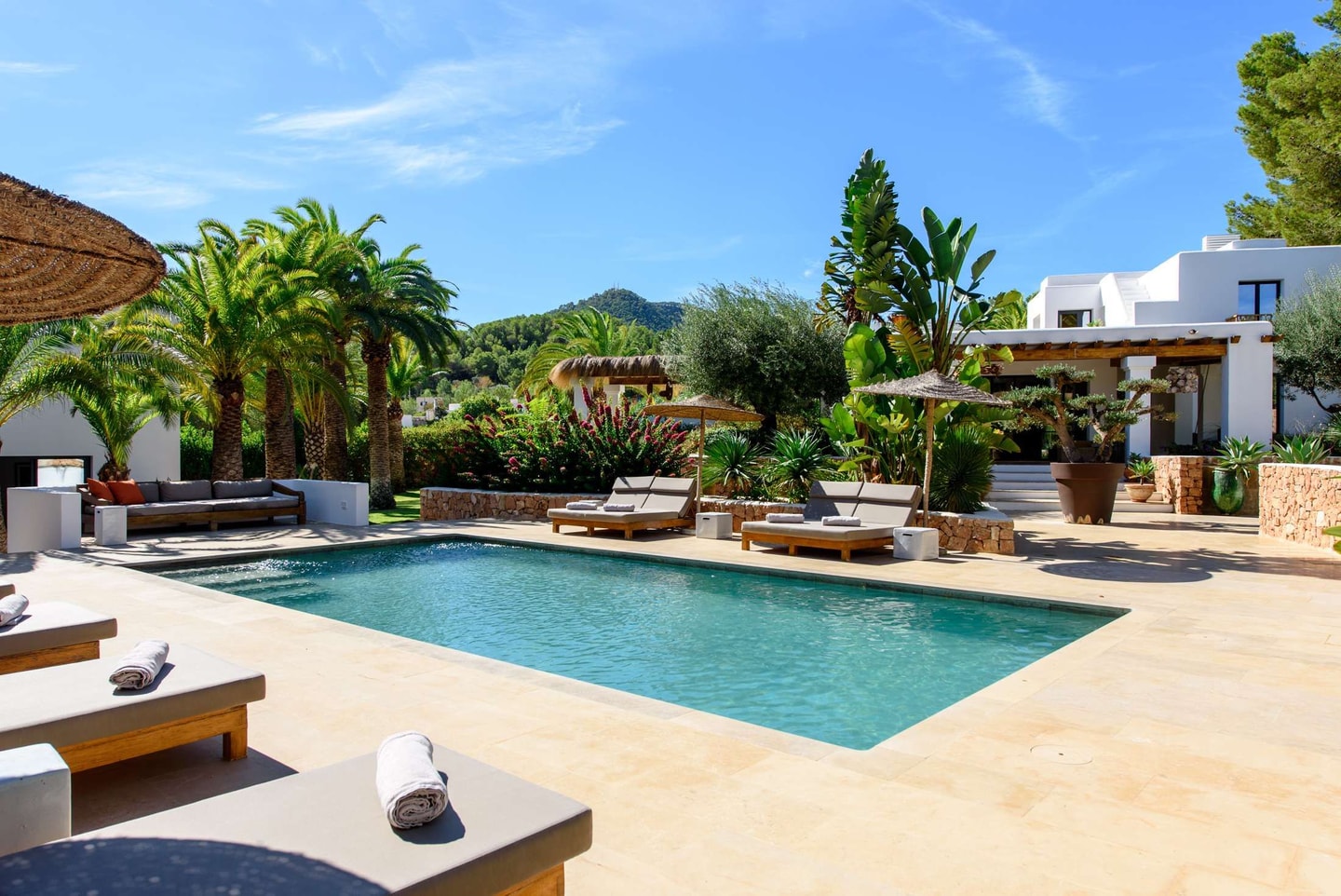 Over 3000 square metres of landscaped gardens surround the villa, designed with palm trees and Corten steel-edged paths. From here, Cala Bassa and Cala Conta lie within ten kilometres, whilst San José offers local restaurants and shops nearby. Days might begin with breakfast on the poolside terrace, followed by beach visits or simply enjoying the ping-pong table in the garden. The roof terrace provides valley views for evening drinks, making the most of Ibiza's western position for spectacular sunsets.