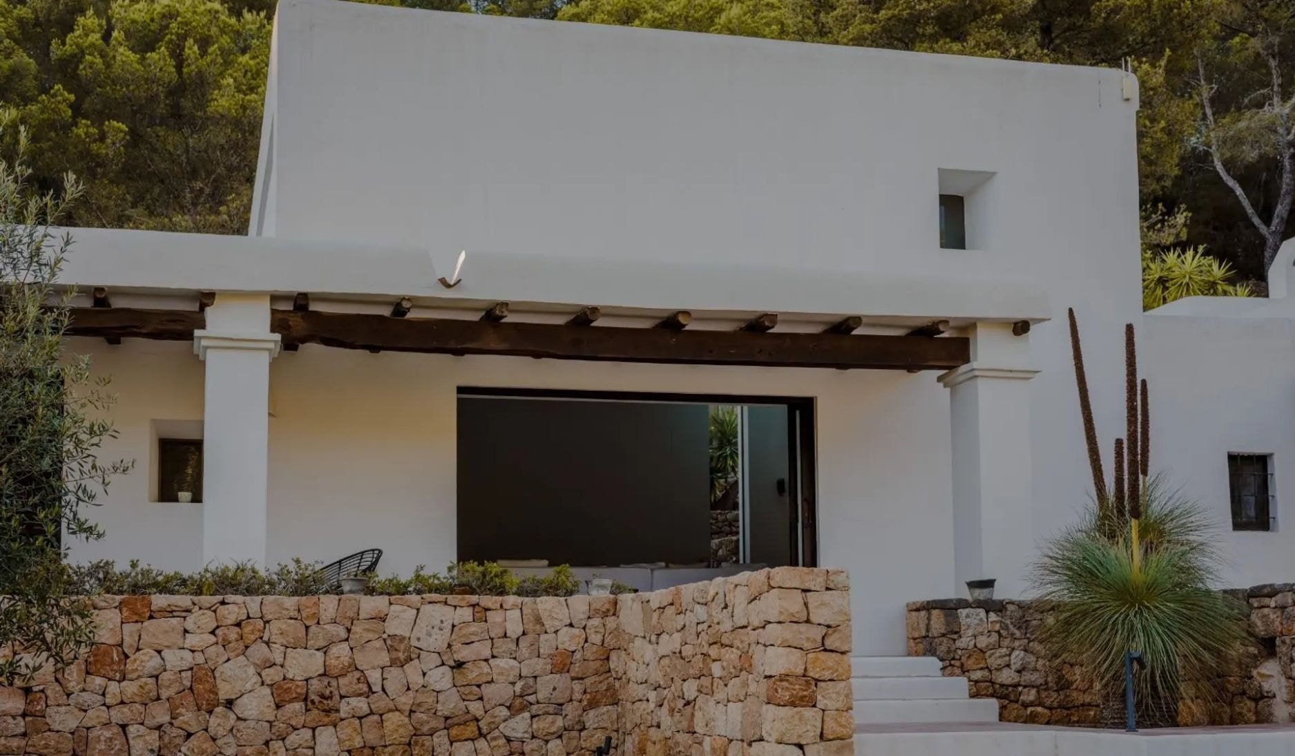 Six-bedroom finca on five hectares of private land close to Ibiza town. A wellness-focused retreat with thermal spa, yoga deck, gym, tennis court and heated pool surrounded by fruit trees and tiered gardens.