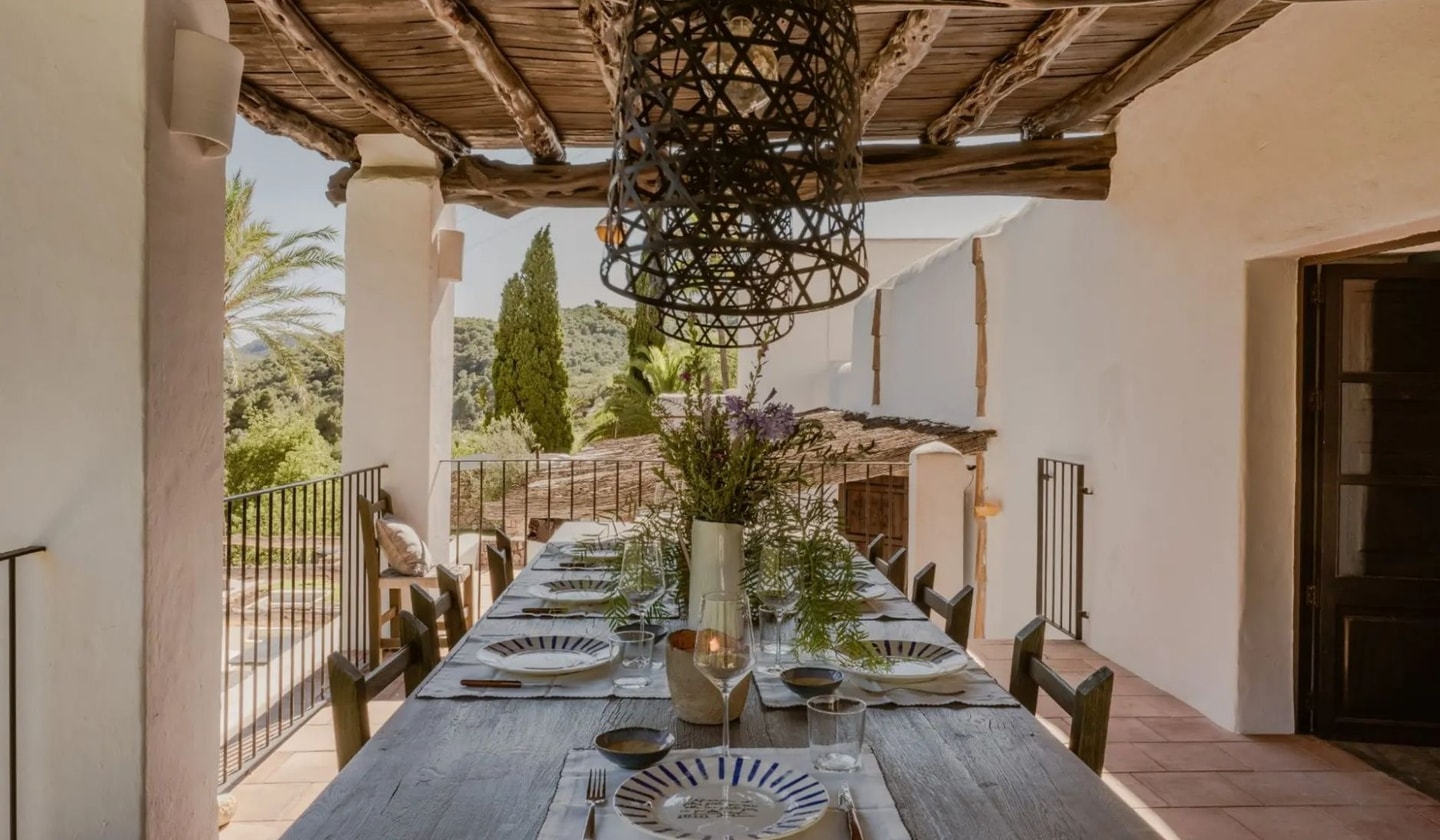 Five hectares of Ibizan countryside wrap around Can Valle, a six-bedroom retreat that feels wonderfully removed from the world while keeping you within easy reach of Ibiza Town. The property spreads across terraced gardens thick with Mediterranean vegetation, creating a private domain where fruit trees mingle with ancient carob and olive groves.