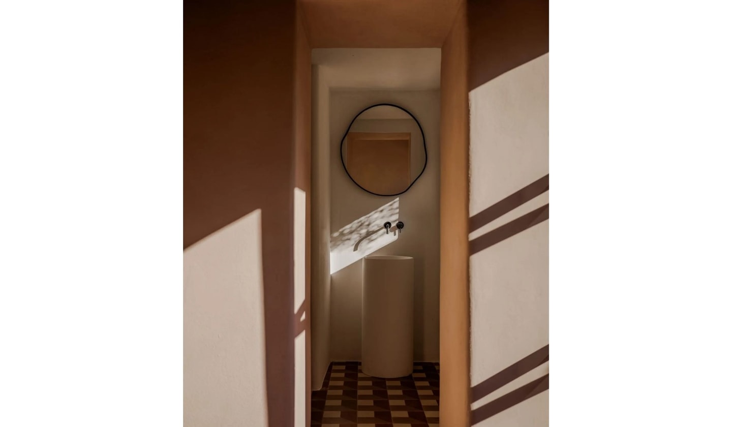 Inside, natural light pours through generous windows onto terracotta and stone-toned marble floors. The main house centres around a skylit kitchen designed for proper cooking, with everything you need for preparing meals from the garden's own produce. Six bedrooms provide comfortable quarters, each styled with rustic touches and artisanal furniture. The principal suite features marble finishes and opens to a private terrace with garden views.