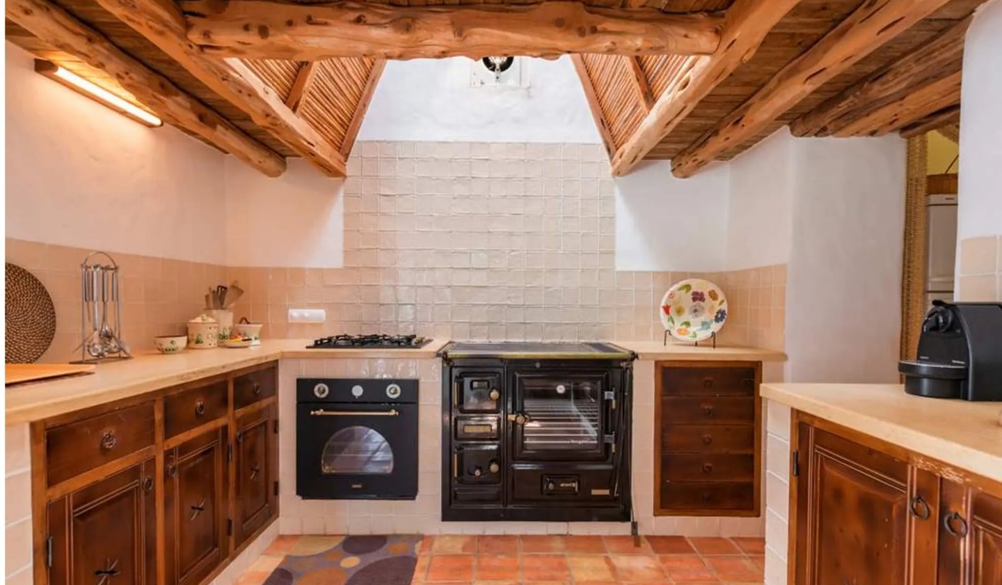 Step through either entrance into an open living space where carefully chosen pieces tell their own story. Family heirlooms and restored antiques fill the rooms, creating an authentic atmosphere throughout. The kitchen, fitted with modern appliances, opens onto a front terrace sheltered by a grape pergola. A smaller living area connects to the dining space, all flowing together in one harmonious room that leads out to the garden terrace.