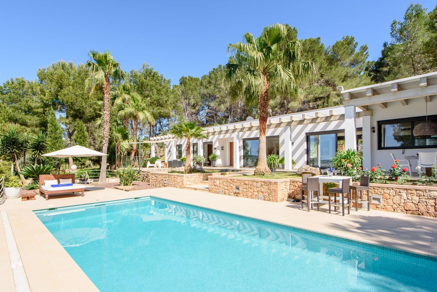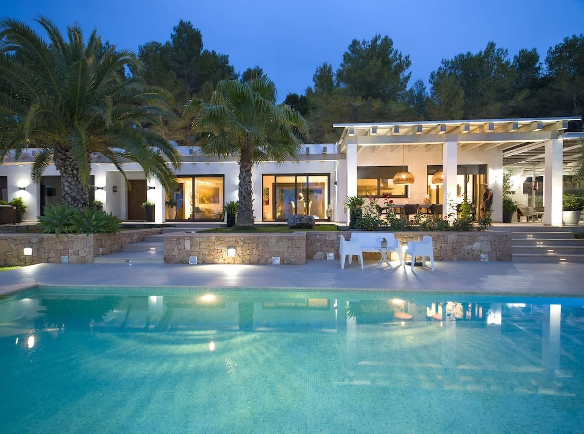 A hillside villa where sunset views take center stage, with west coast beaches and San Antonio within easy reach. Well-maintained gardens frame a generous pool area perfect for lazy days.