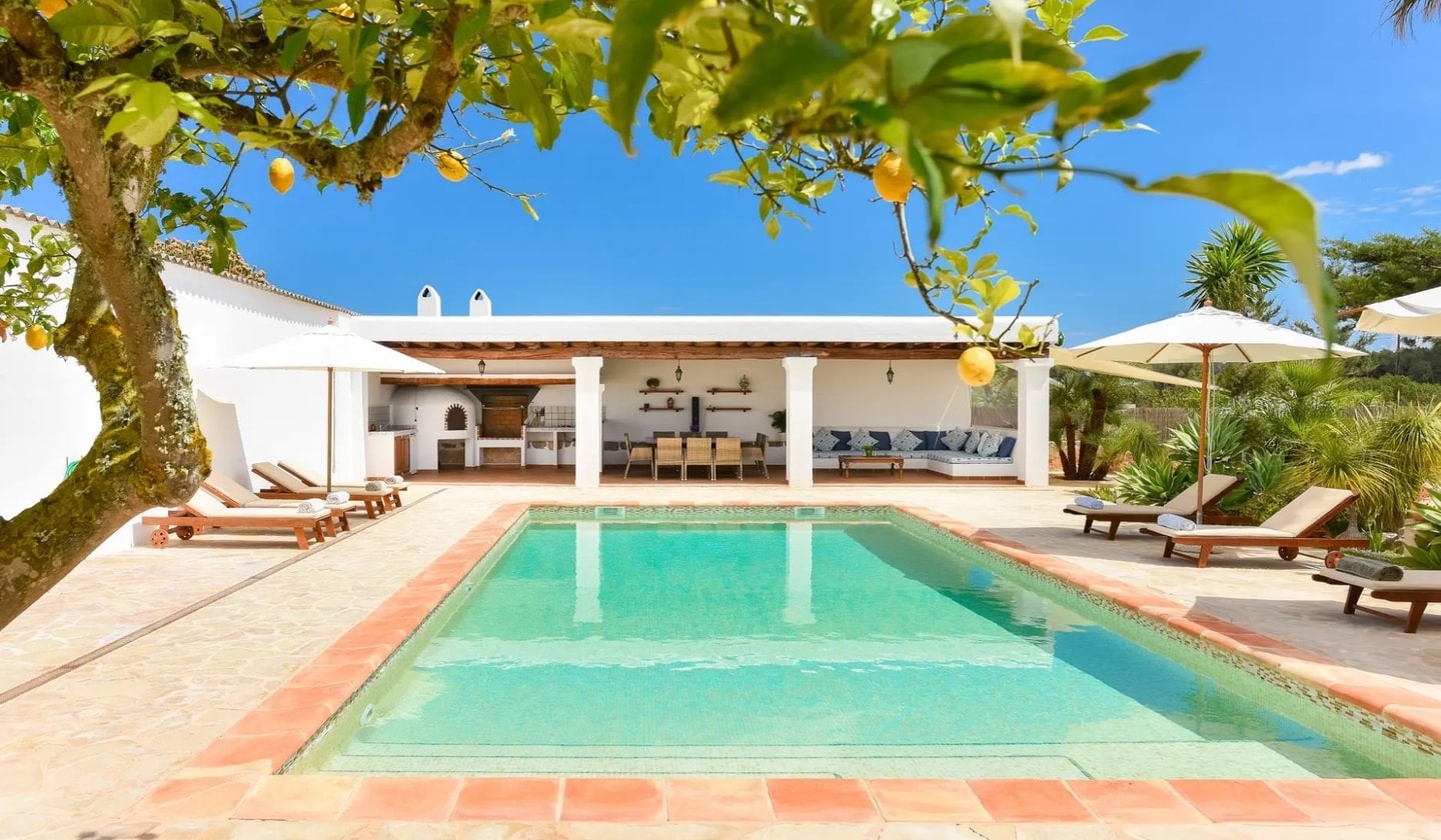 The tropical garden unfolds around an 11x5 metre pool, where orange trees perfume the air. A covered terrace houses the outdoor kitchen, barbecue and dining table for twelve, with a poolside bathroom for convenience. Benirràs beach lies 15 minutes away, while Santa Eulària and Ibiza town are within 20 and 25 minutes respectively. Though the road to Santa Gertrudis passes nearby, the garden faces away from traffic, and those substantial walls ensure peaceful nights.