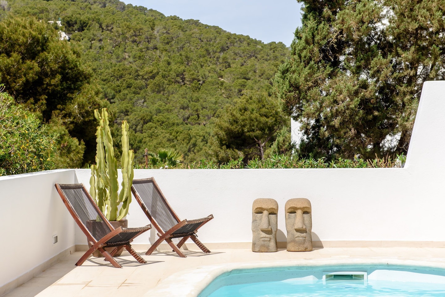 From street level, stone steps climb to the first floor where the kitchen opens to the left, compact yet fully equipped for holiday cooking. The living room stretches to the right, its rustic dining table flanked by wooden benches and a generous white sofa facing the fireplace. French doors frame those famous Ibiza views and lead to the terrace, where six can gather around the dining table whilst the barbecue sizzles nearby.