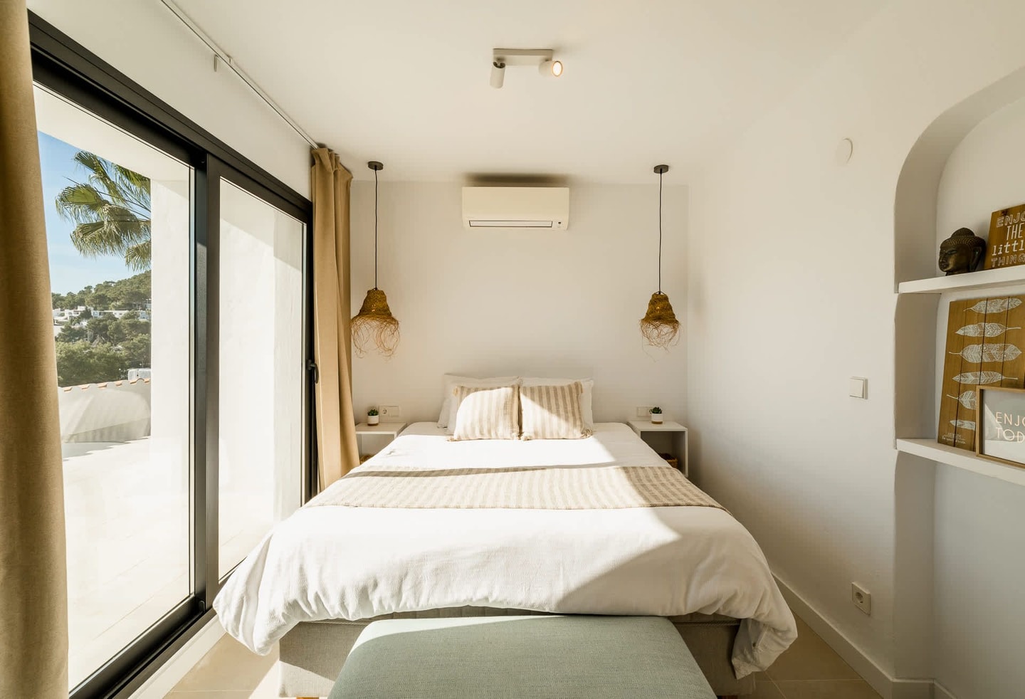 Four-level hillside house with panoramic Ibiza views, just a short stroll from Cala Llonga beach. Multiple terraces and a private pool create perfect spaces for family gatherings.