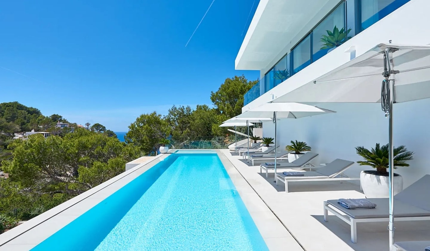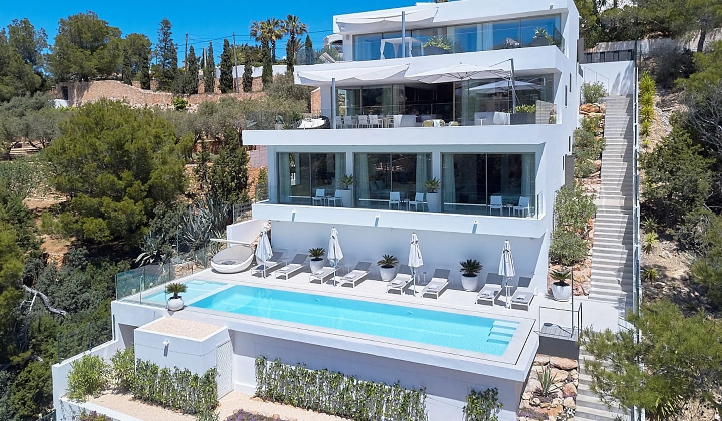 A modern villa in San José where ocean views stretch endlessly from every floor. Private steps lead directly to the sea, while terraces and pools create your own Mediterranean retreat.