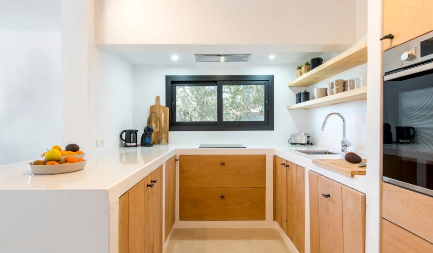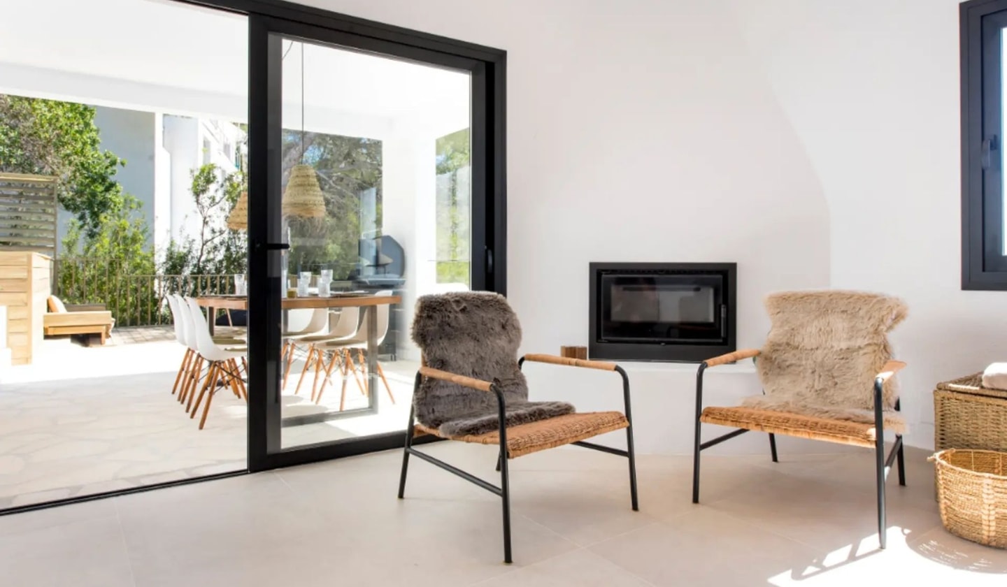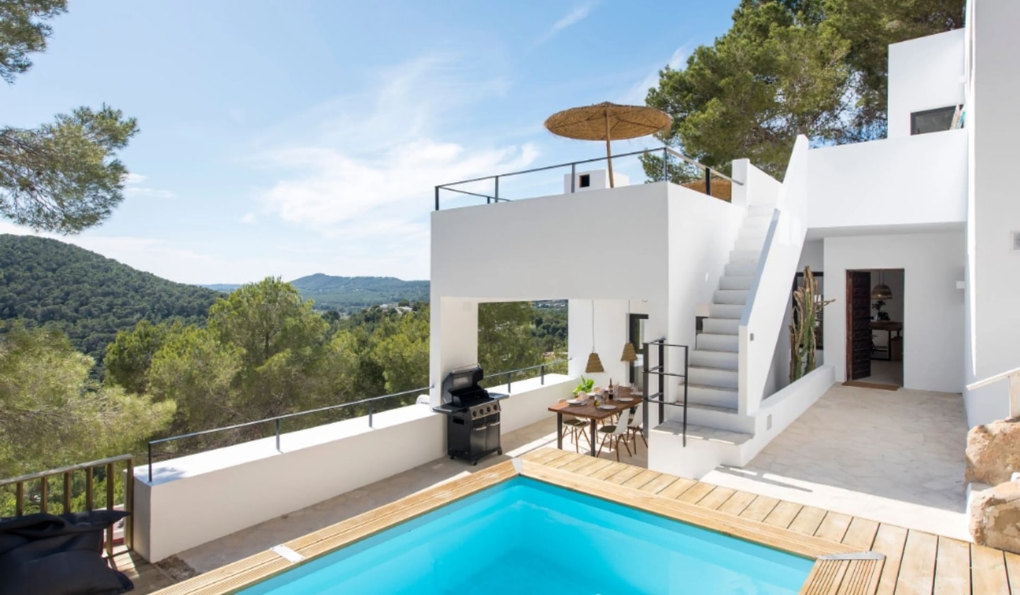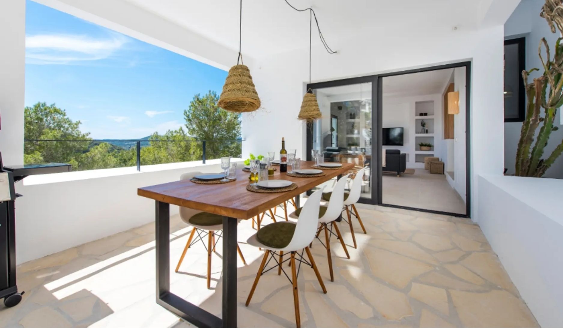 Tucked into the hillside above Cala Llonga, Can Verde sits at the highest point of the Valverde urbanisation, where three walking trails begin their journey through the Ibizan countryside. This recently renovated house brings together natural materials and thoughtful design, with two generous terraces that catch views of the Mediterranean from different angles. The quiet cul-de-sac location keeps things peaceful, while the beach at Cala Llonga lies just five minutes away by car.