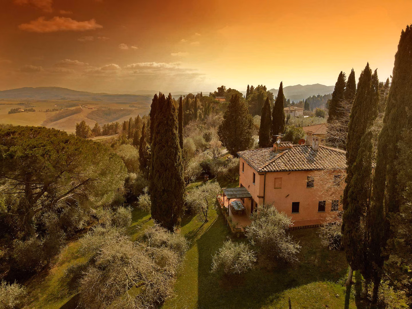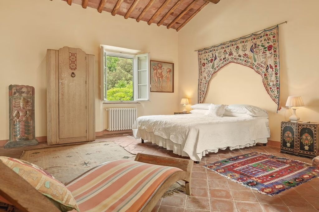 Centolivi wraps around a Tuscan hilltop with the kind of views that make you forget why you were checking your phone. This villa sits in the countryside between Pisa and Florence, where five bedrooms and a separate guest house spread across grounds dotted with olive trees. A private pool catches the afternoon light while a shaded loggia offers respite from the heat, complete with comfortable seating that invites long conversations over local wine.