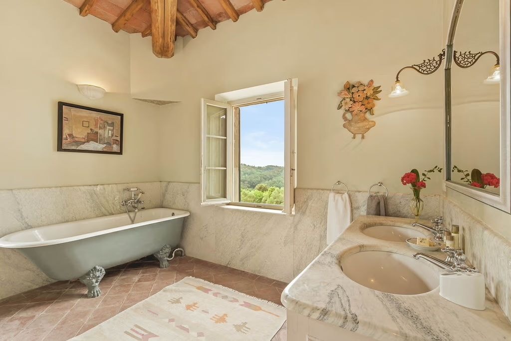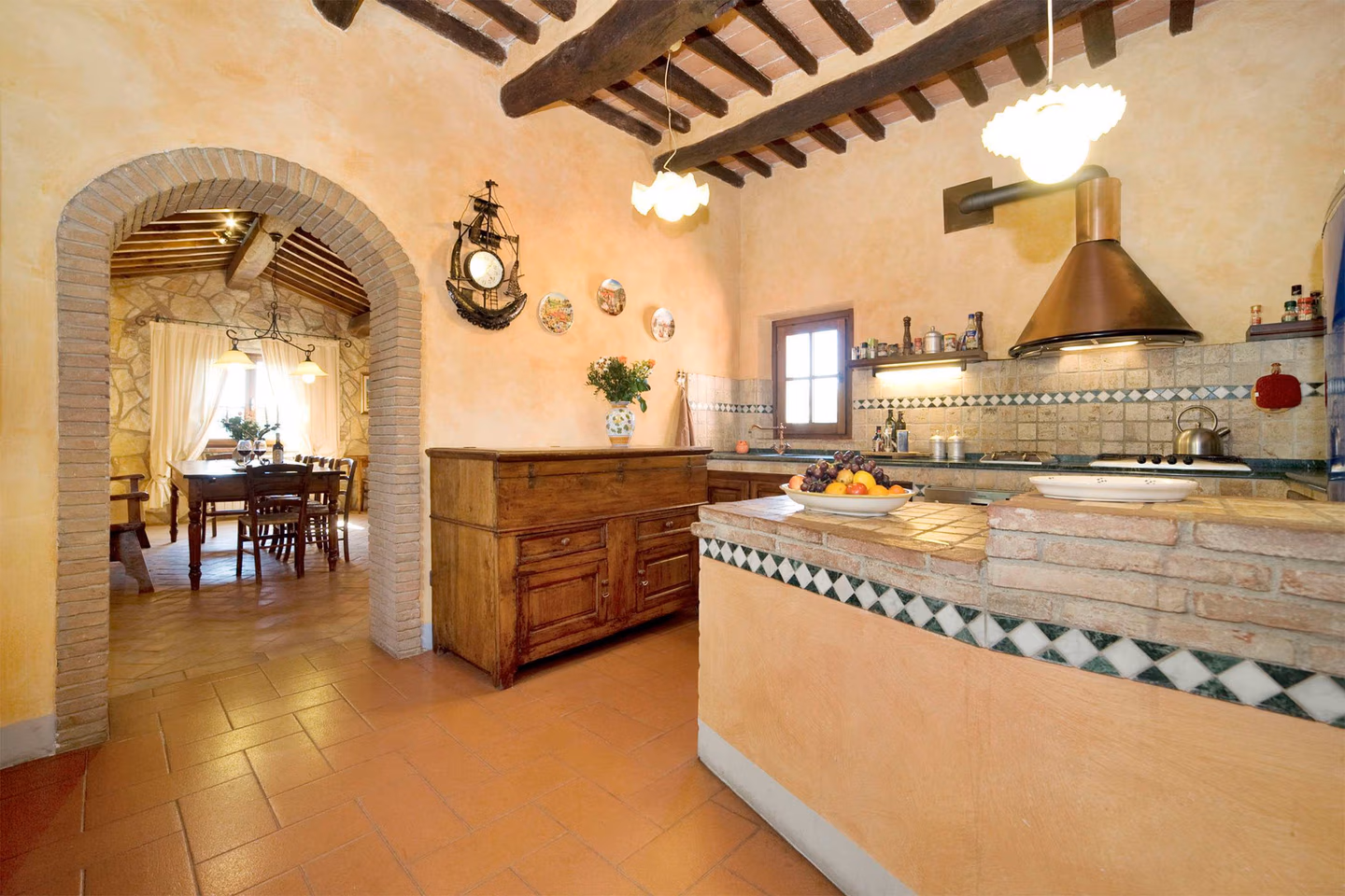 A traditional Tuscan villa with panoramic countryside views, this property offers five en-suite bedrooms plus a guest house. The fenced pool and expansive terraces create the ideal setting for family gatherings.