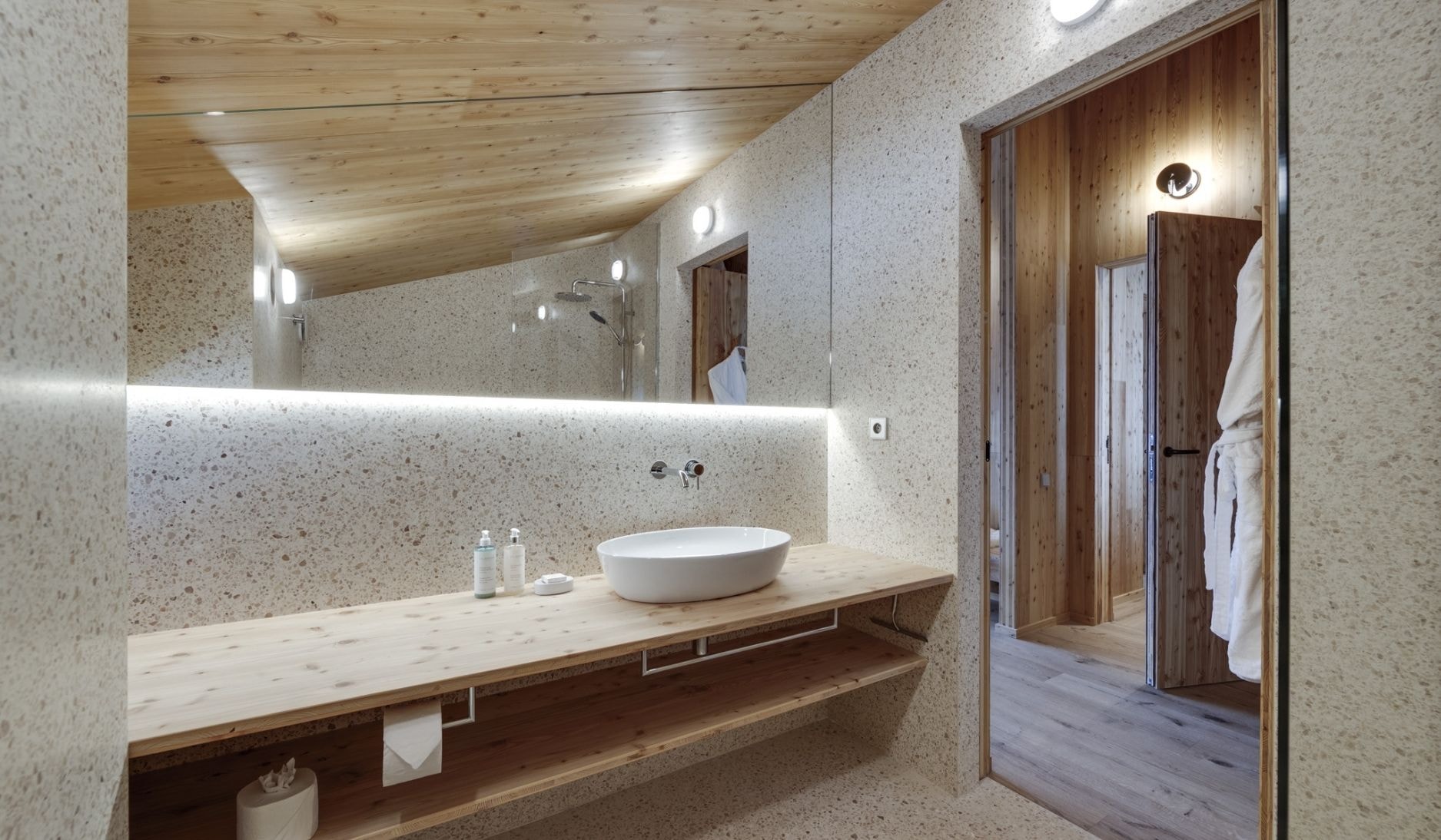 The first floor opens into an expansive living area designed for gathering. Natural stone meets warm timber throughout, creating spaces where groups naturally congregate after mountain days. The architect-owner's vision shows in every detail, from the hand-crafted staircase to the natural stone in the bathrooms. A faux fireplace, Smart TV, fully equipped kitchen and all the practical touches make settling in effortless.