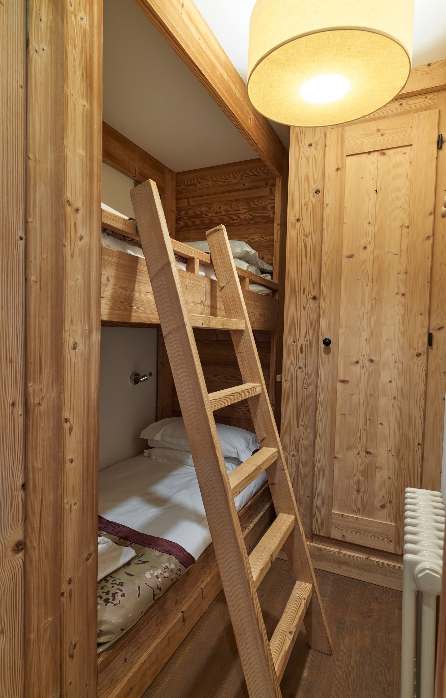 Three bedrooms provide flexible sleeping arrangements. The master suite connects directly to the living area and includes a queen bed with en-suite bathroom complete with bath, shower attachement, glass panel, sink, WC and heated towel rail. The second bedroom offers twin beds and opens onto its own small balcony. A compact bunk room without windows serves as the third sleeping space, fitted with built-in single beds and a curtain door, sharing the bathroom complete with shower, sink, WC and heated towel rail with bedroom two.