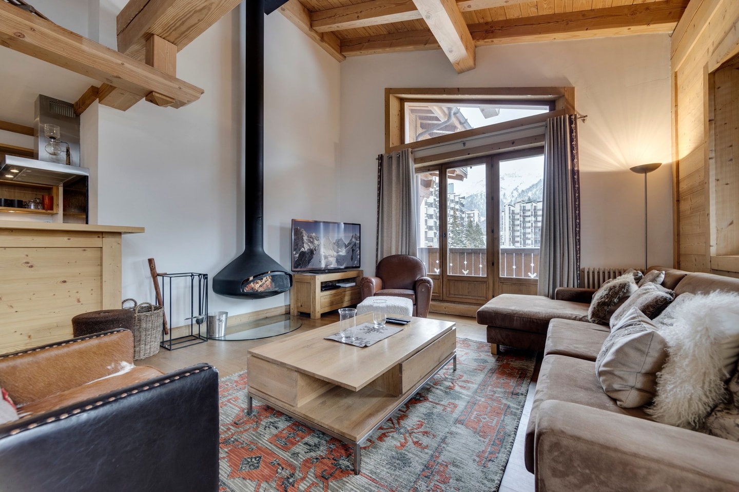The open-plan living area combines kitchen, dining, and lounge spaces in a bright, welcoming layout. The kitchen features black stone worktops, a four-ring electric hob, oven, dishwasher, and a three-drawer freezer with coffee machine. The dining table accommodates six ten, while the living room's L-shaped sofa stretches along one wall facing the TV and cosy modern fireplace. Two armchairs complete the living space with mountain views and ample light.