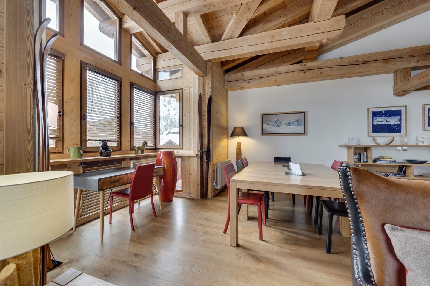 A penthouse loft with vaulted ceilings and wood-burning fireplace in the heart of Val d'Isère. Spacious mountain living with two bedrooms, two balconies, and underground parking.