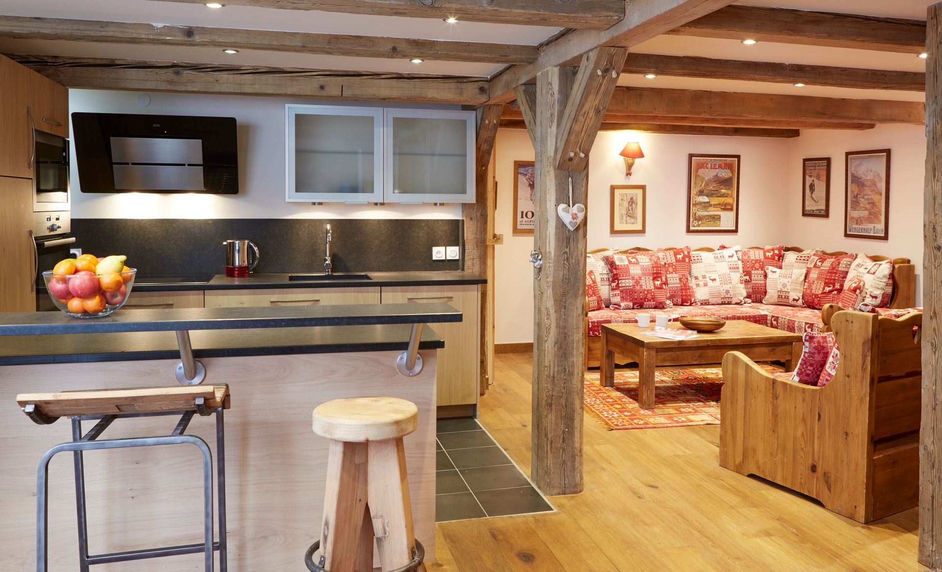 The apartment unfolds across two floors, with the main living areas and one bedroom suite on the entry level. A dedicated cloakroom handles all your ski gear before opening into the main room. The kitchen occupies the far corner, complete with breakfast bar, induction hob, and dishwasher. An expandable dining table seats eight, while leather sofas and upholstered chairs create distinct seating areas. Two separate TV zones mean everyone finds their own space.