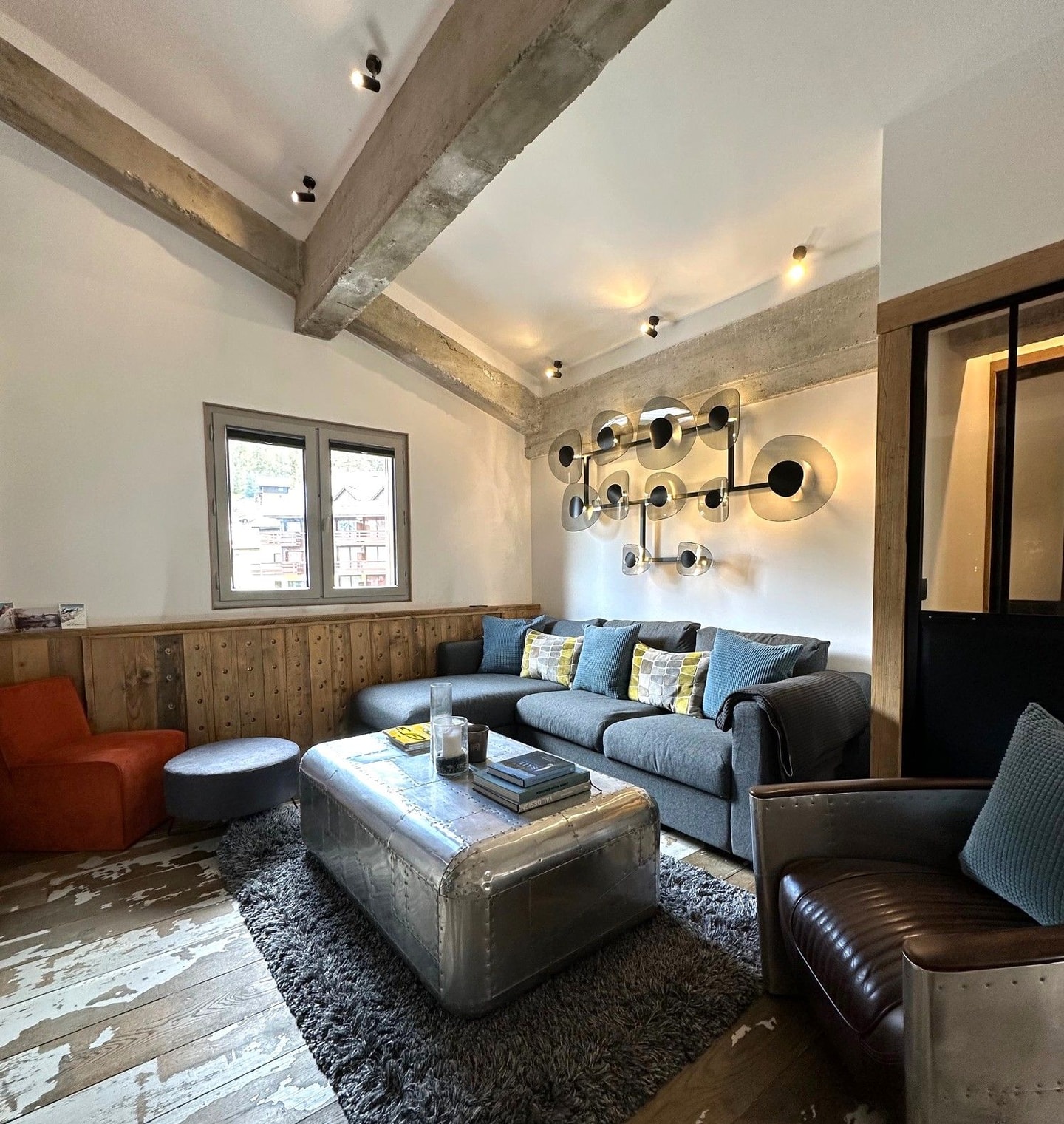 A loft-style apartment in Val d'Isère with industrial-chic design and clever use of space. Double-height ceilings and window-filled dining alcove create an airy feel for up to five guests.
