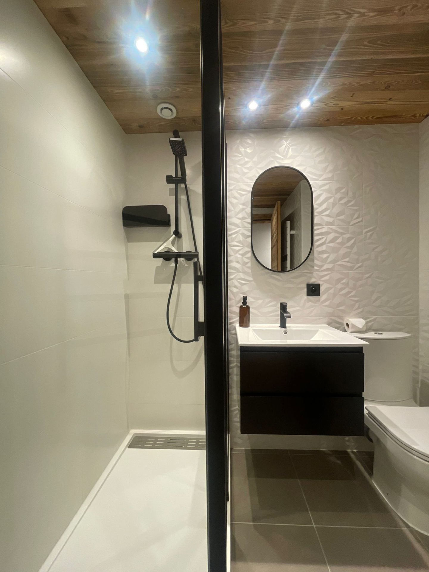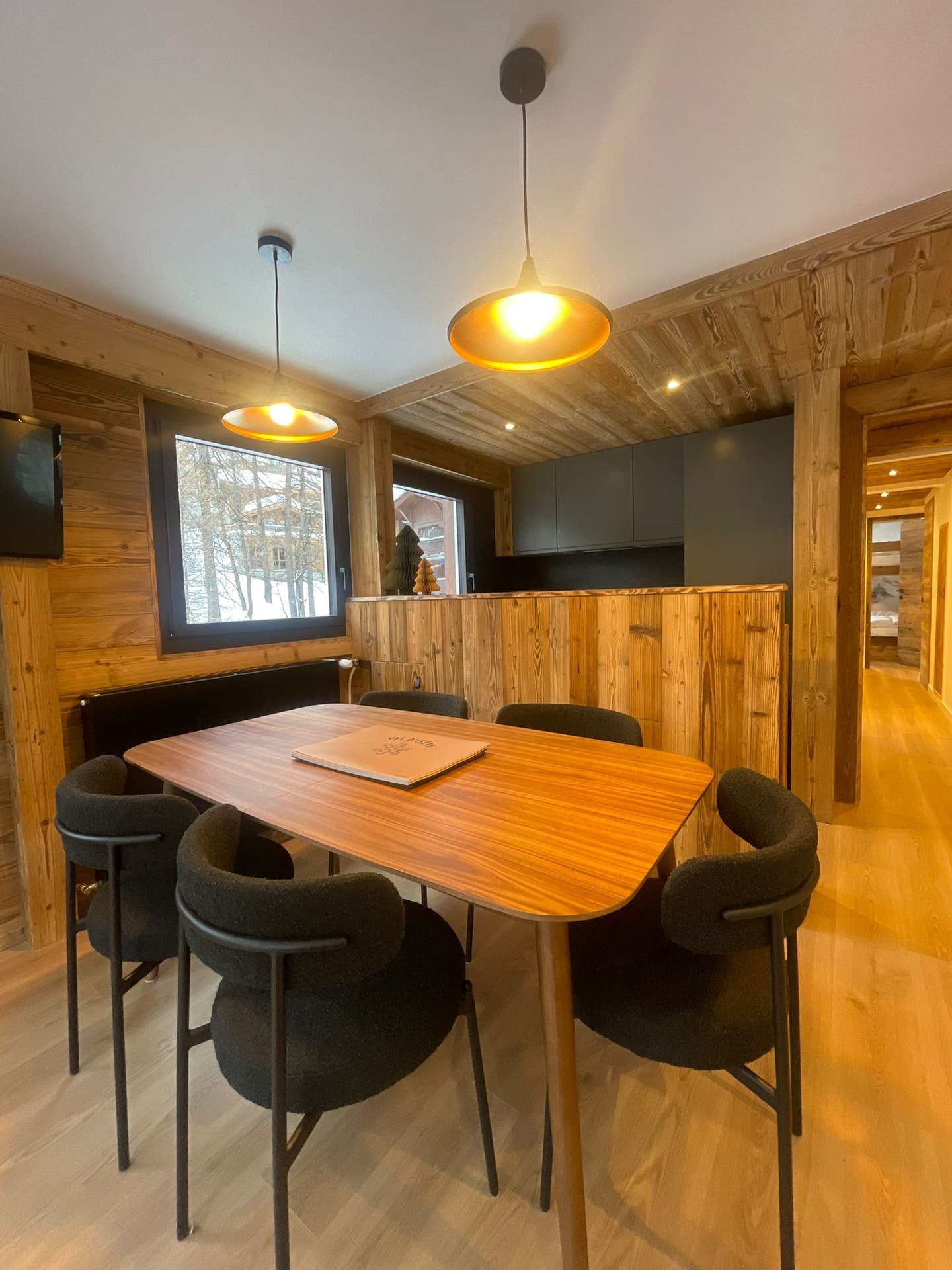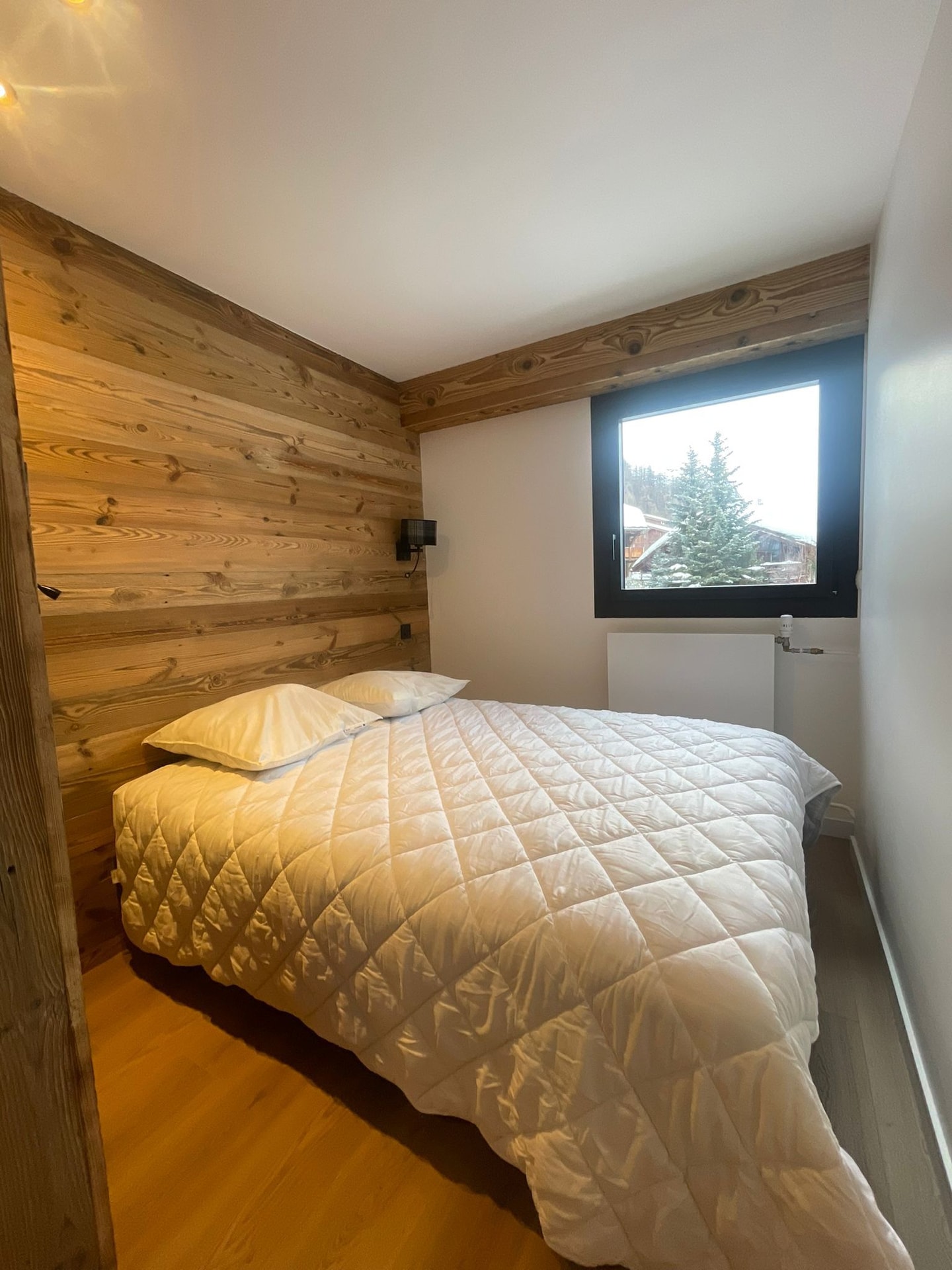 Fresh from renovation for the 24/25 season under new ownership, the space strikes a thoughtful balance between traditional Savoyard charm and modern comfort. Old wood meets new throughout, creating warmth without sacrificing practicality. The entrance hallway offers generous hanging space, with a bright shower room opposite featuring WC and basin. A washing machine sits discreetly tucked within the hallway cupboards.