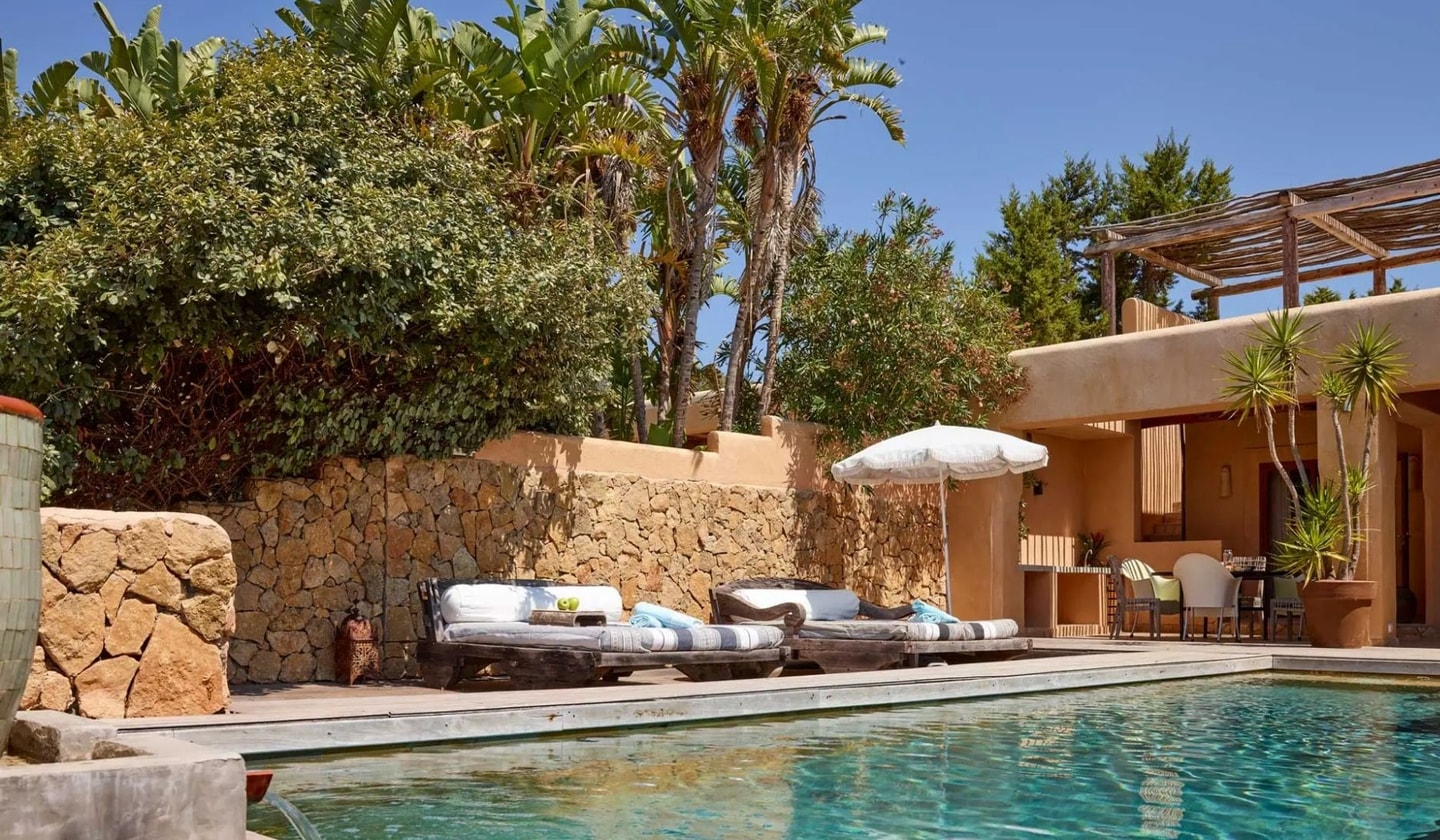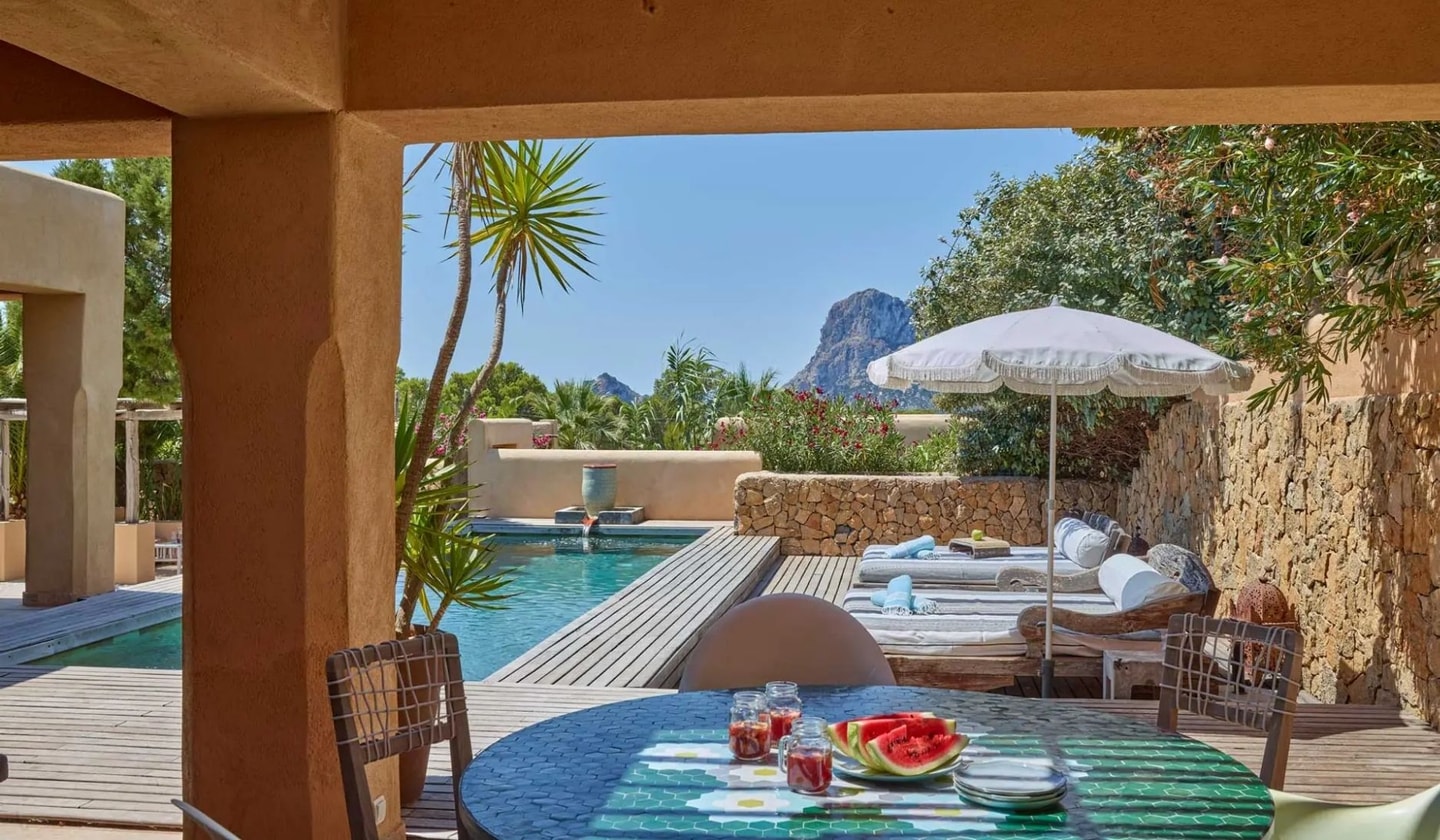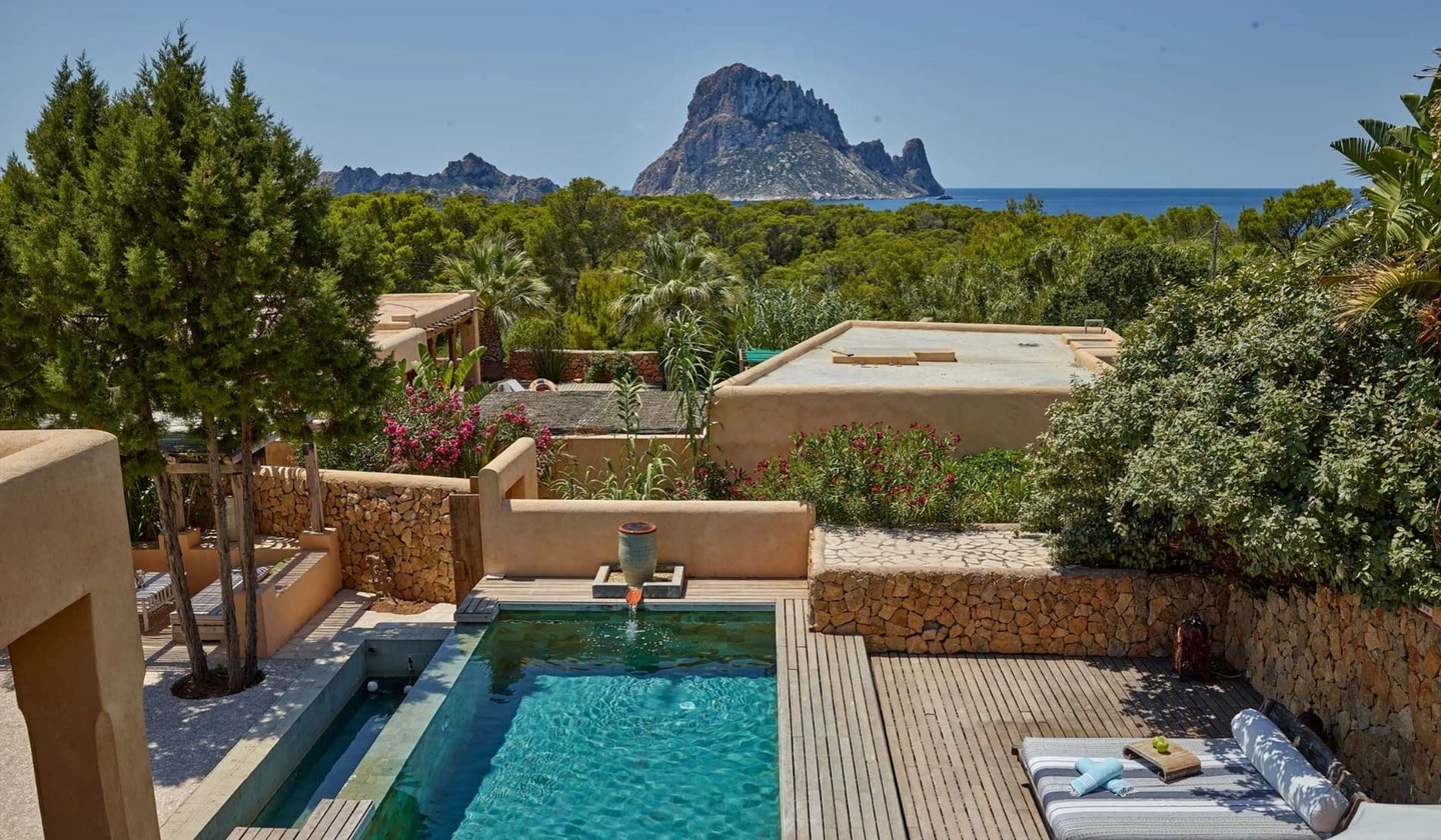La Camelia offers a different perspective on Ibiza, one where the island's natural beauty takes precedence over its party reputation. This three-bedroom house sits in a peaceful corner of the island, with views that stretch out to Es Vedrà, the mystical rock formation rising from the Mediterranean. Two bedrooms occupy the main house, each opening onto shaded terraces, while a third bedroom with its own bathroom sits in a separate guest house tucked into the garden.