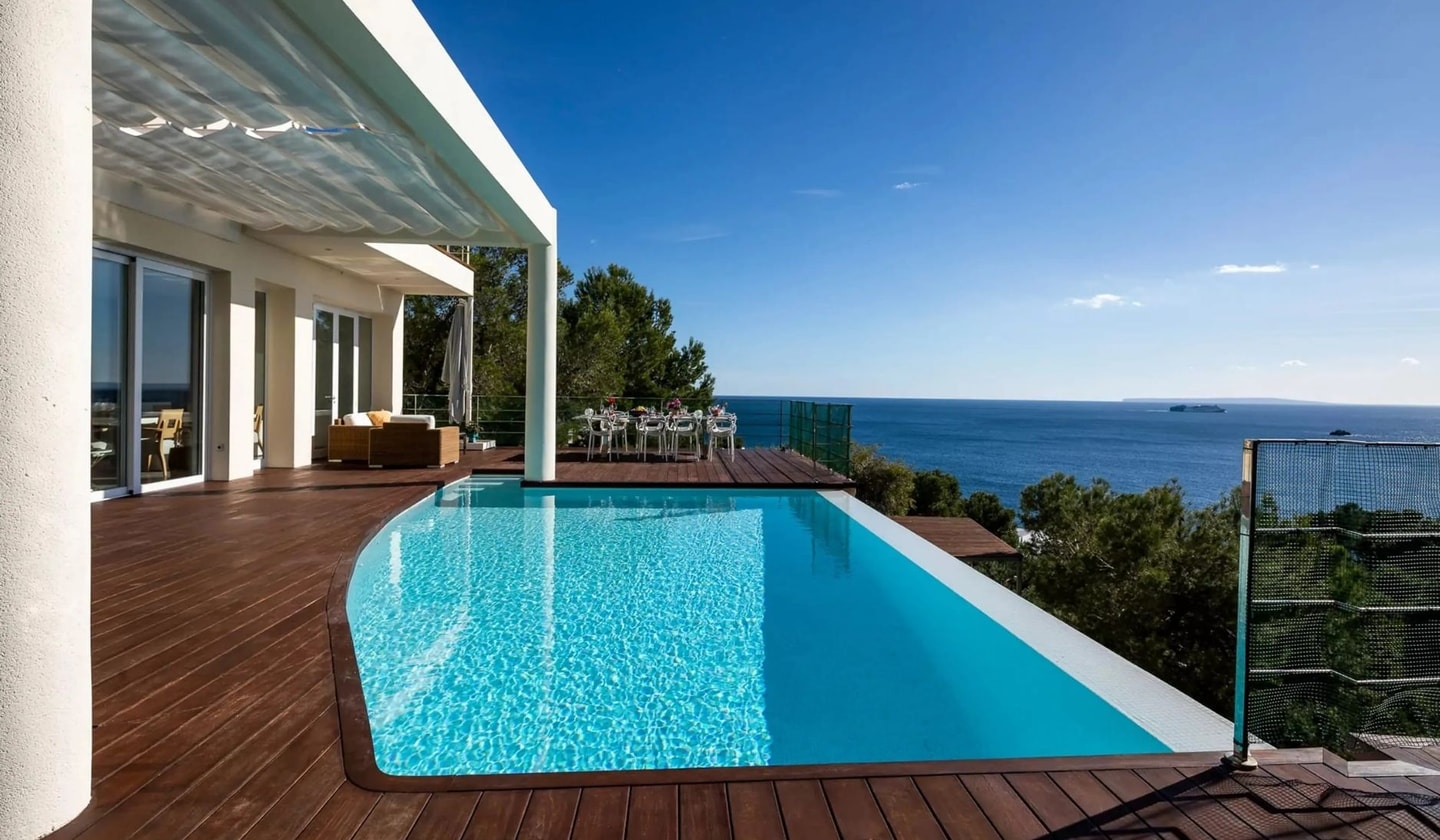 Six bedrooms and three pools define this architect-designed villa in Roca Llisa, where minimalist design frames views across the Mediterranean to Formentera.