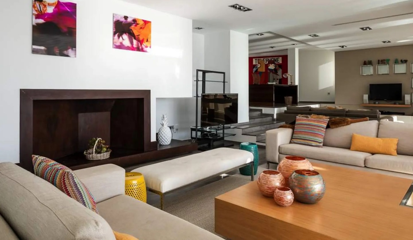 The main living space spans 150 square metres, flooded with light from floor-to-ceiling windows that frame those sea views. A fireplace anchors the room for cooler evenings, while a Balinese-style dining table seats ten. The 55-square-metre kitchen, separated by sliding doors, comes fully equipped. Four of the bedrooms occupy the upper floor, each with en-suite bathrooms and private terraces facing the water.