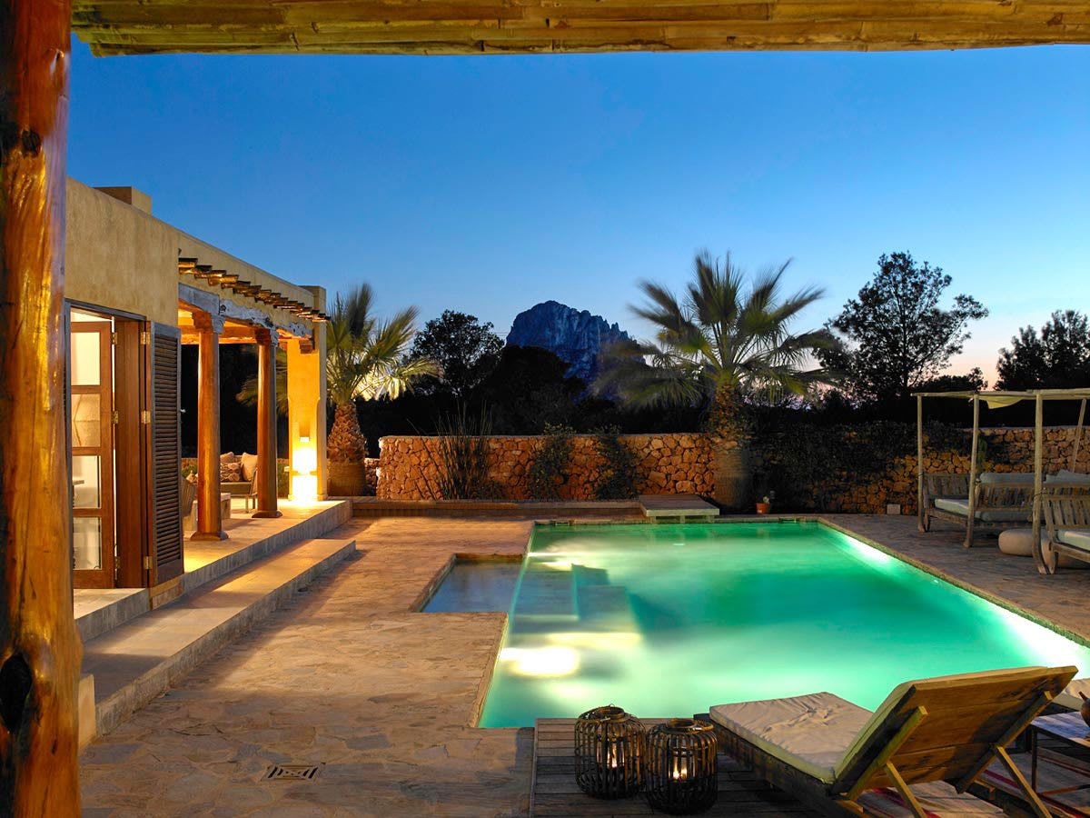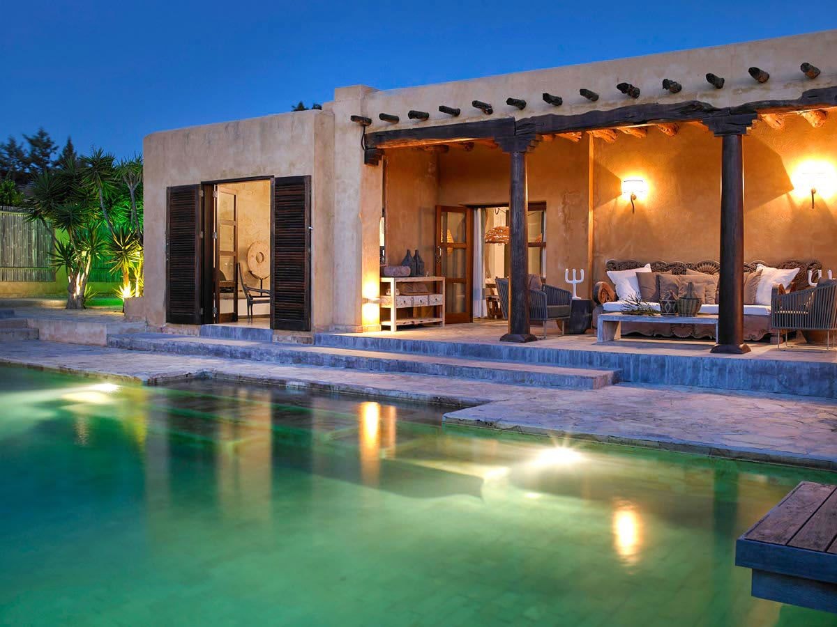 With tropical gardens and a large river-stone pool, this three-bedroom villa on Ibiza's southwest coast feels like your own private boutique hotel. Wooden beams and stone walls frame thoughtfully designed spaces.
