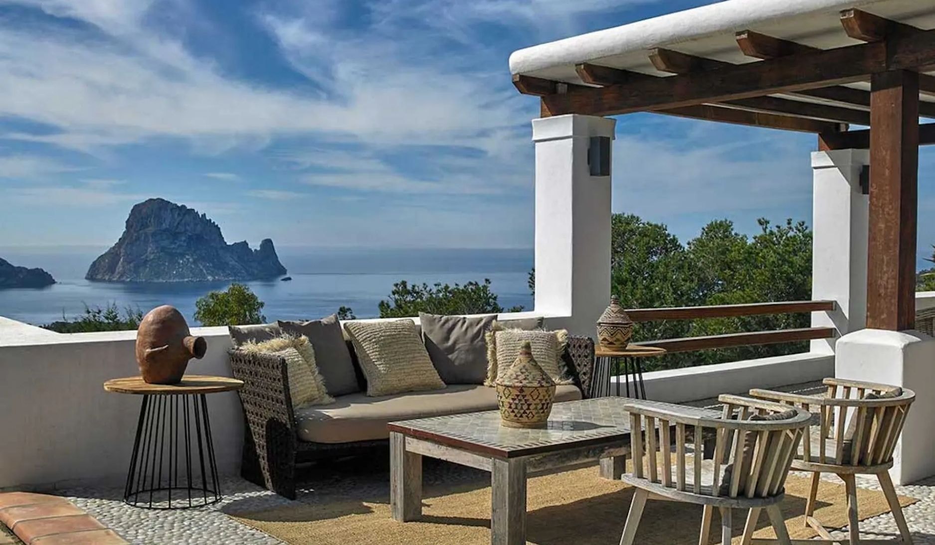 A hilltop haven on Ibiza's southwest coast, where Mediterranean views and Es Vedrà create the perfect backdrop for relaxation. Designed by Rolph Blackstad with global influences throughout.