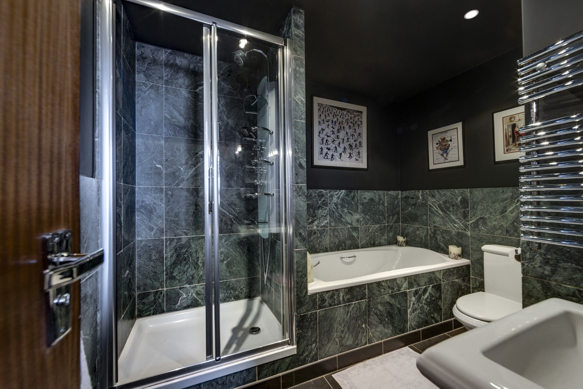Three bedrooms, each with en-suite facilities, provide flexible sleeping arrangements for families or friends. The master bedroom, situated to the right of the entry hall, features a double wardrobe with generous storage for clothes and an en-suite bathroom with separate shower and bath, complete with two heated towel rails. The second double bedroom, accessed through the kitchen area, includes wardrobe storage and its own shower room. Upstairs, the open-plan third bedroom features a fixed double bed and a fold-down double, ideal for flexible sleeping arrangements, with a full en-suite bathroom attached to the room.