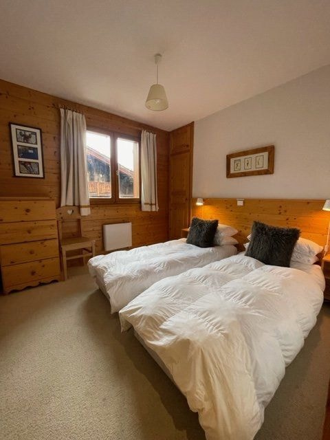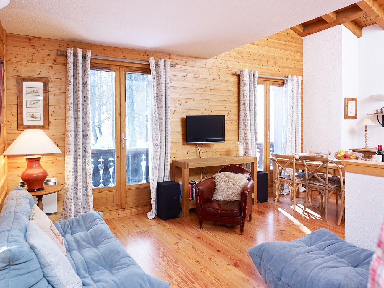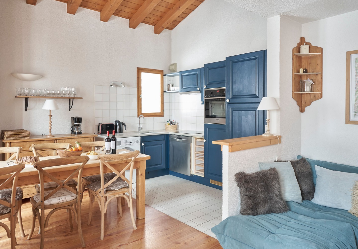 A third-floor apartment in the heart of Val d'Isère awaits, thoughtfully sized for four guests across two bedrooms and two bathrooms. Blue Ligne Roset sofas and a leather chair create a welcoming living space, while warm wood accents and classic bathroom tiling add mountain charm. The vaulted ceiling and panoramic windows frame the Alpine landscape beautifully.