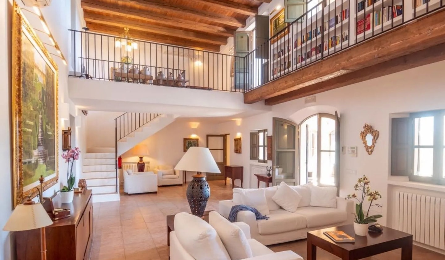 Between Santa Eulària and Santa Gertrudis, this eight-bedroom villa brings together Tuscan-inspired architecture with Ibiza's countryside charm. Views stretch across rolling hills to Santa Eulària bay.
