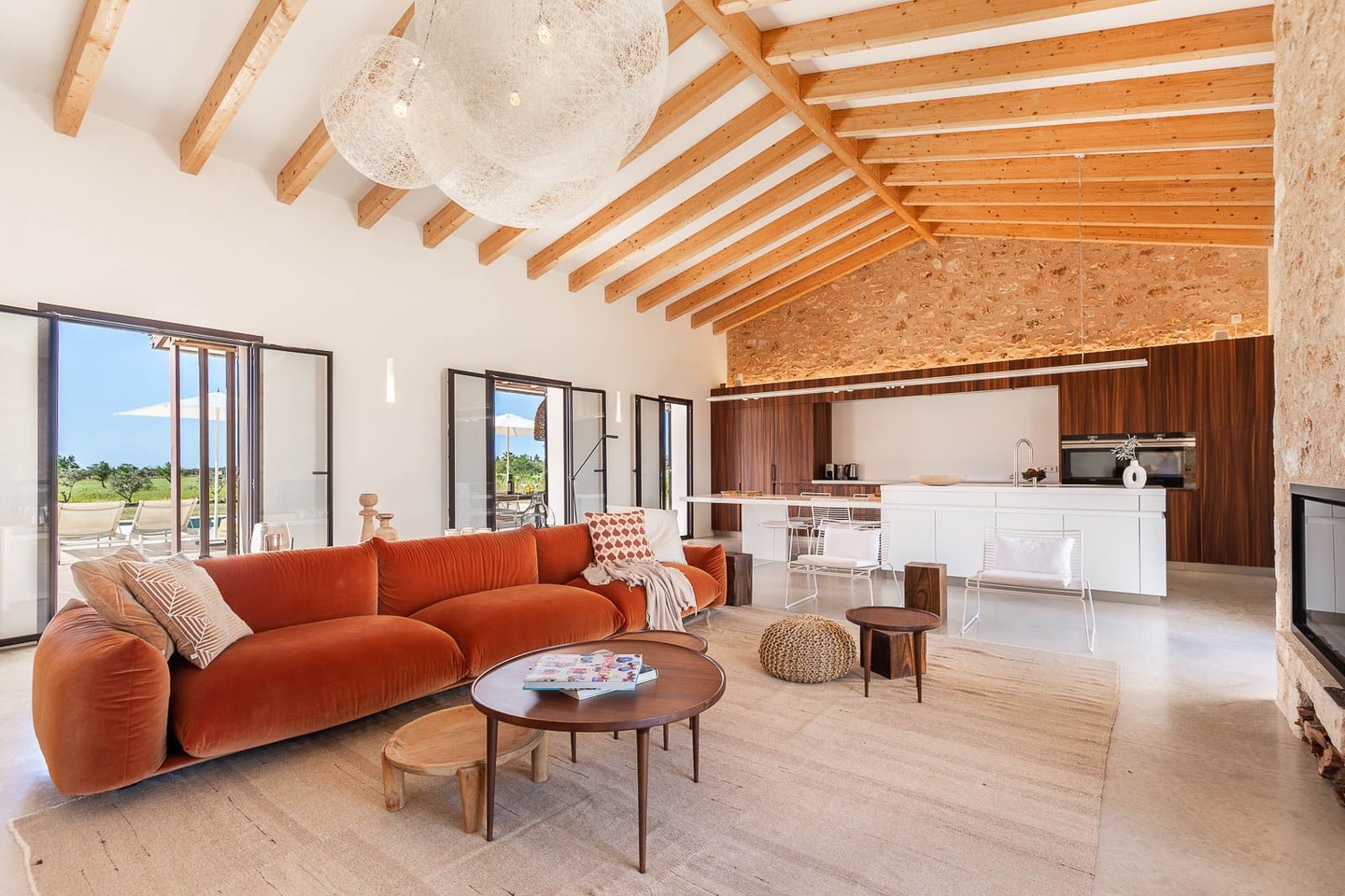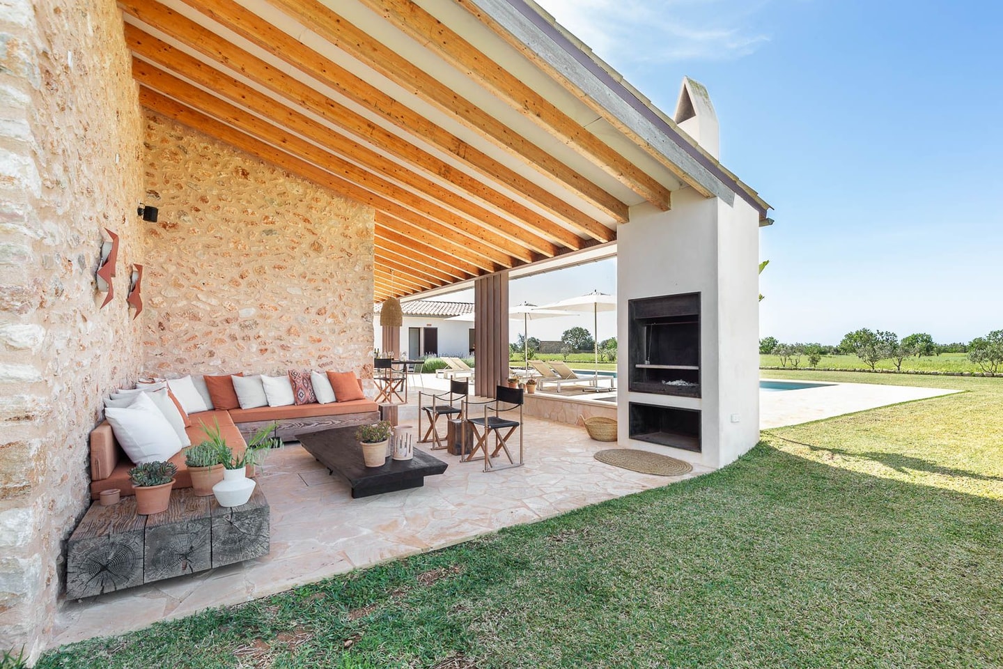 The interiors blend rustic elegance with modern comfort across spacious living areas. A cosy fireplace anchors the outdoor lounge, while inside you'll find satellite TV, high-speed internet, and a fully equipped kitchen with induction hob, dishwasher, and coffee maker. The villa accommodates guests across thoughtfully appointed bedrooms, each with air conditioning and underfloor heating. A washing machine, dryer, and iron ensure practical comfort during longer stays.
