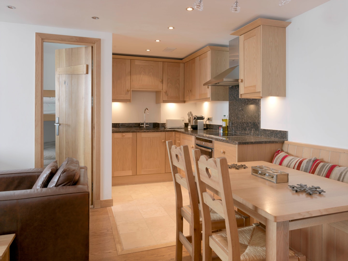 The living space combines practicality with comfort. Unwind on the leather sofa and chair and catch up on UK Freeview channels, though heavy snow may occasionally disrupt reception.The sofa bed converts into a bed, providing an additional option if your group of four want to spread out. Wooden floors with underfloor heating run throughout, while the kitchen features granite countertops and stainless steel appliances for easy meal preparation.