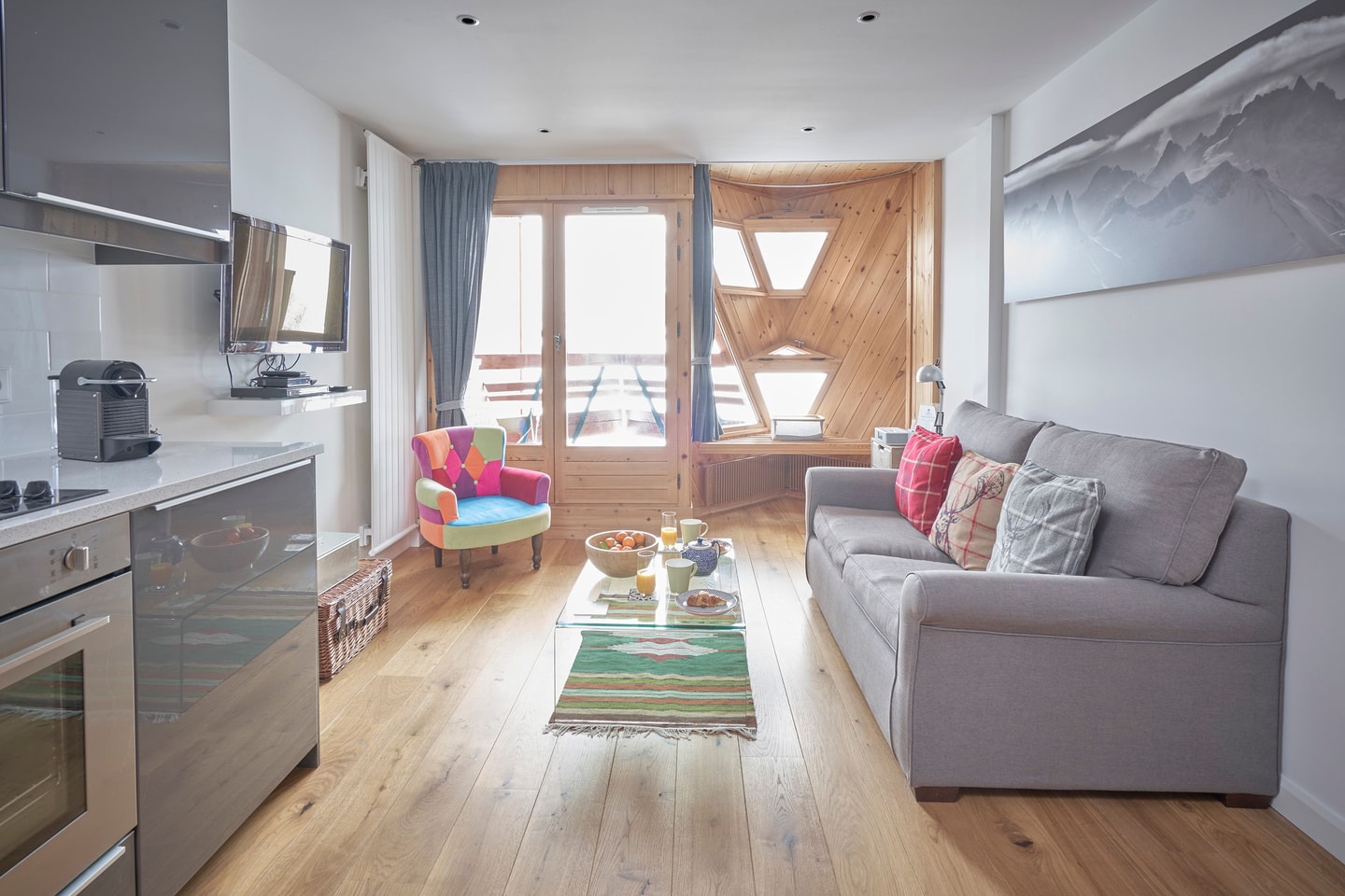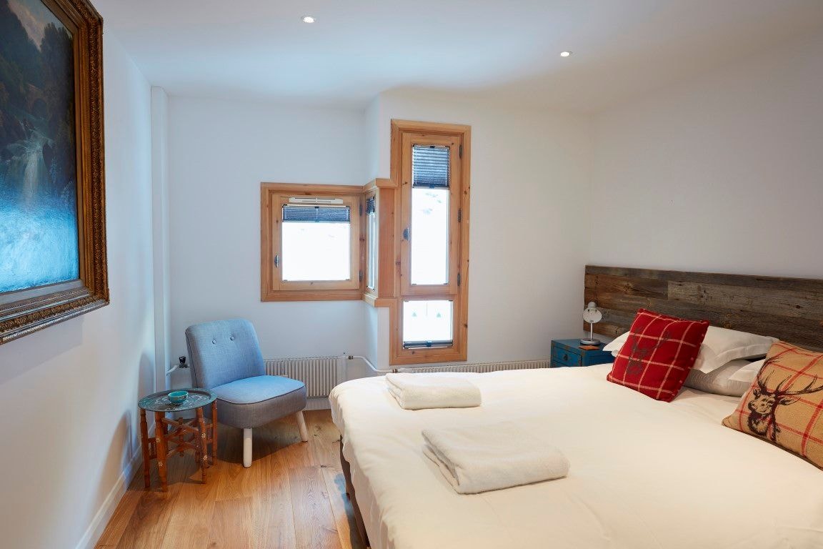 The second-floor apartment welcomes you with an entrance hall, offers practical storage for outdoor shoes, ski boots, and other winter gear. This leads into a main room, filled with natural light that enhances the space. The kitchen comes fully equipped with induction hob, dishwasher, oven and microwave, all set against quartz worktops. A high dining table with four stools sits opposite, while the open plan living area features a sofa bed and lounge chair facing a wall-mounted smart TV with access to Netflix and Amazon Prime.