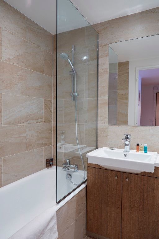 The bedroom offers twin Sealy beds, which can be zipped together to create a double, along with storage and bedside tables. The bathroom includes a bath with glass panel and wall-mounted shower. A separate cupboard near the kitchen houses the washing machine. The sofa bed in the living room allows the apartment to sleep four people in total, with a privacy curtain separating the sleeping area from the entrance when needed.