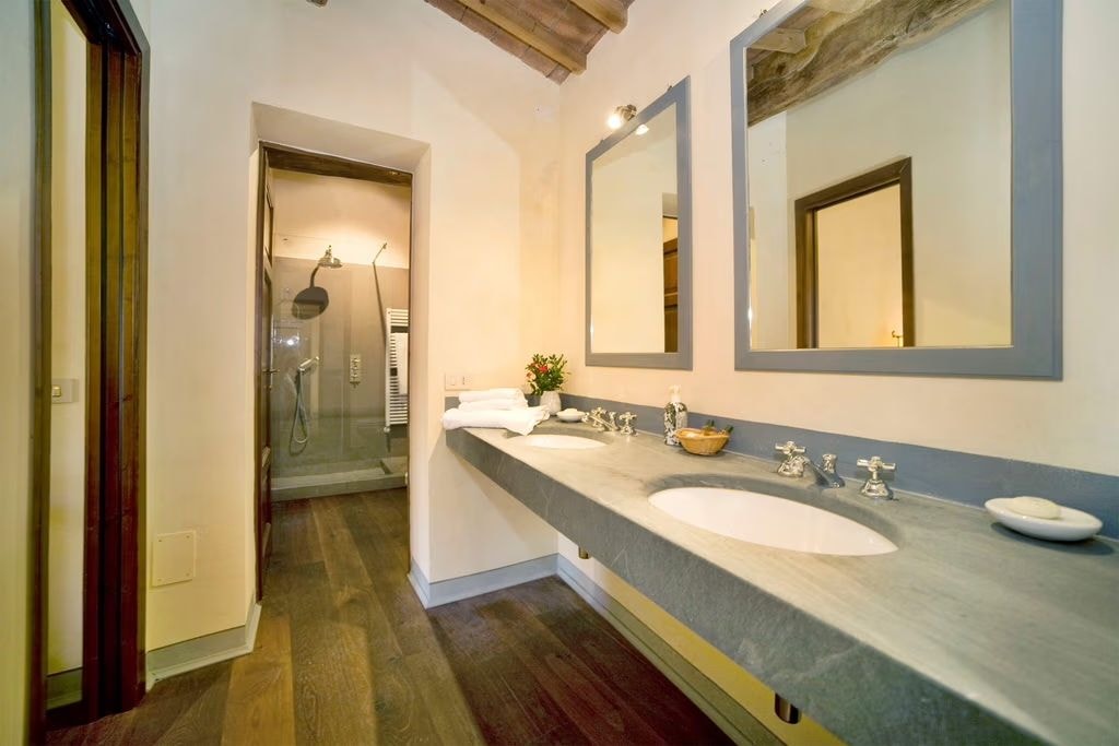 The ground floor houses three bedrooms that share two bathrooms, while the tower holds the master suite. Recently renovated, this upper level features a sitting room and double bedroom with its own bathroom, all cooled by air conditioning. The property's ancient kitchen can become the setting for traditional Tuscan dinners prepared by local staff, should you fancy an evening of regional flavours without leaving the grounds. Throughout the villa, you'll find the thoughtful balance of historic character and practical amenities.