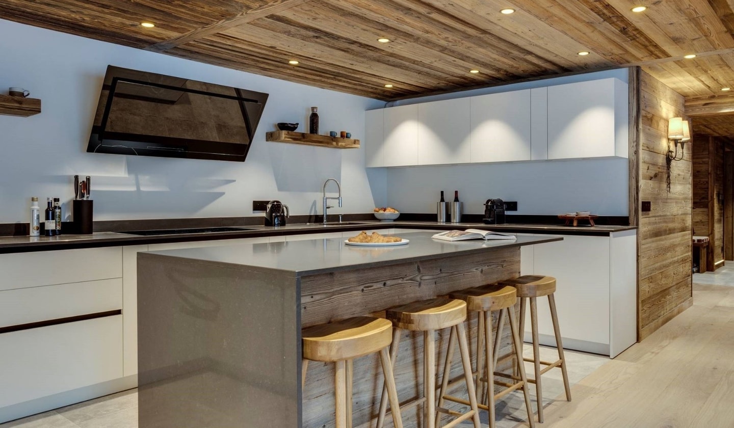 Step inside to find an entrance hall with a practical cloakroom for all your winter gear. The apartment unfolds into a generous open-plan space where kitchen, dining and living areas merge. Ten upholstered chairs gather around a natural wood dining table, while the kitchen features a breakfast bar with four stools, double ovens and two fridges. A Nespresso machine, juicer and modern appliances complete the setup.