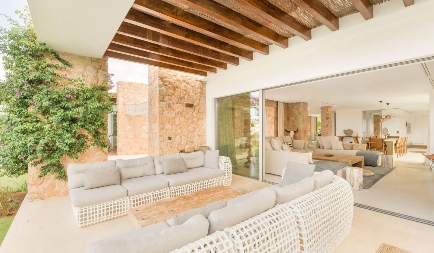 Four bedrooms and sea views just 400 metres from Cala Conta beach. An L-shaped pool stretches beside lawned gardens, while inside, spacious rooms open to each other with natural ease.