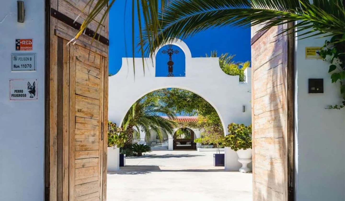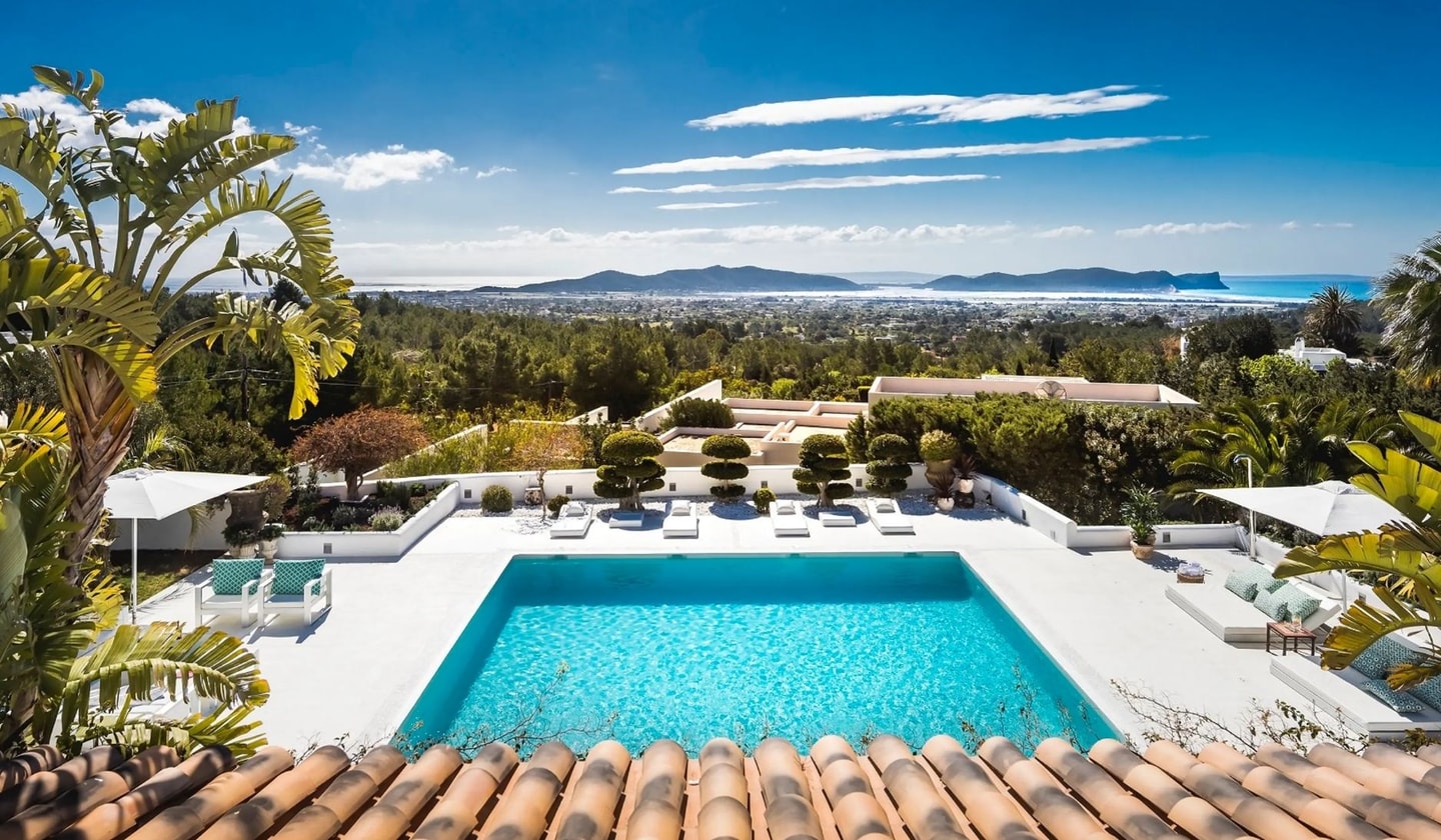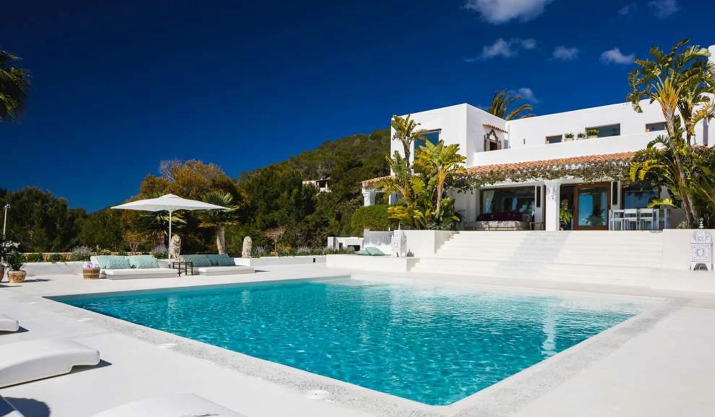 A hillside retreat between Ibiza Town and the coast, this traditional finca-style villa offers six bedroom suites across 8,000 square metres with views to Las Salinas and Formentera.