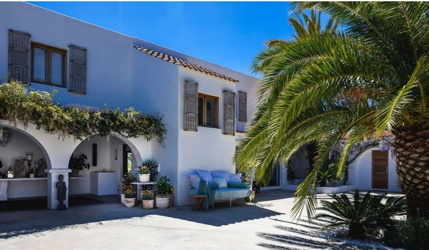 A whitewashed villa sits halfway up a hillside on Ibiza's southwest coast, eight minutes from Ibiza Town. Built in the traditional finca style, this property spreads across 8,000 square metres of south-facing land. From here, you'll spot Las Salinas stretching out below and Formentera floating on the horizon. The nearest beaches, Playa d'en Bossa and Talamanca, are just minutes away by car.