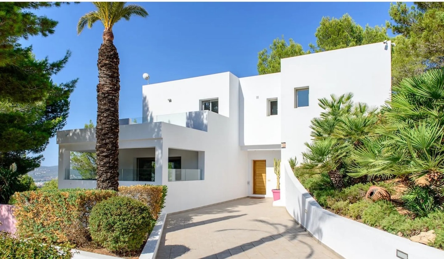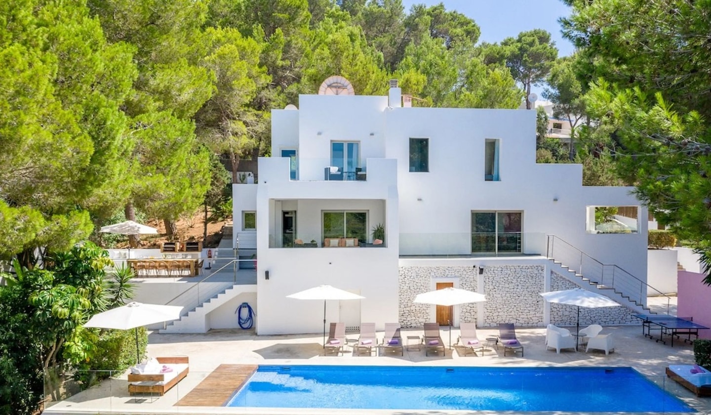 A minimalist retreat in western Ibiza with sweeping views over San Antonio Bay. Six bedrooms spread across two floors, a heated pool, and easy access to the island's finest beaches.