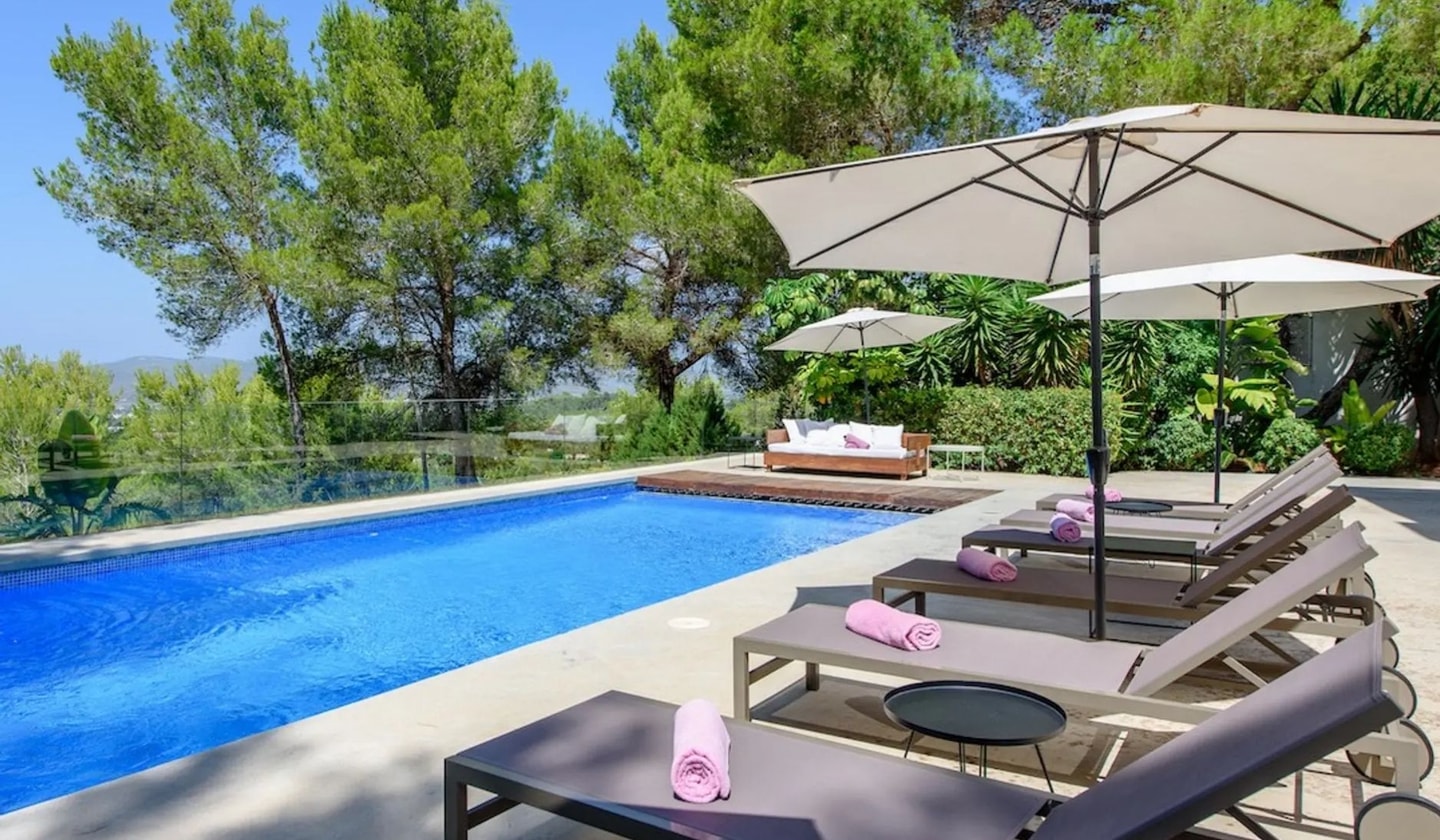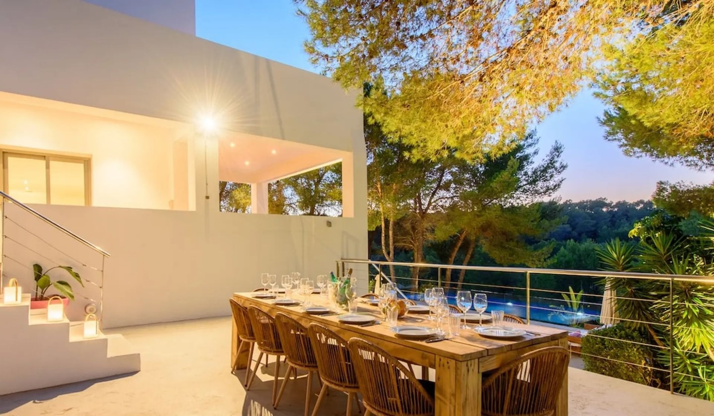 The location puts you within easy reach of Ibiza's finest western beaches. Cala Tarida, Cala Conta and Cala Bassa all lie nearby, each offering clear waters and beachside dining. San Antonio provides local amenities just minutes away, while Ibiza Town sits 17.5 kilometres east for those seeking nightlife or marina dining. Days here move between poolside lounging on the provided sunbeds, beach excursions, and long dinners at the outdoor table beside the double barbecue as the sun sets over the bay.