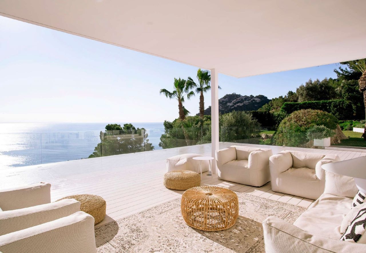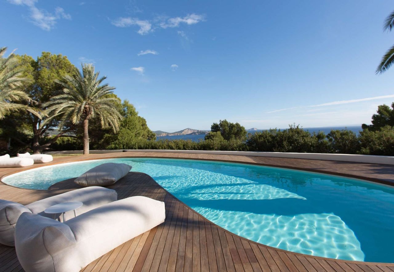 Villa Lantana reveals itself in Es Cubells' most exclusive enclave, where five bedrooms frame Mediterranean views and terraces invite long afternoons by the oasis-shaped pool.