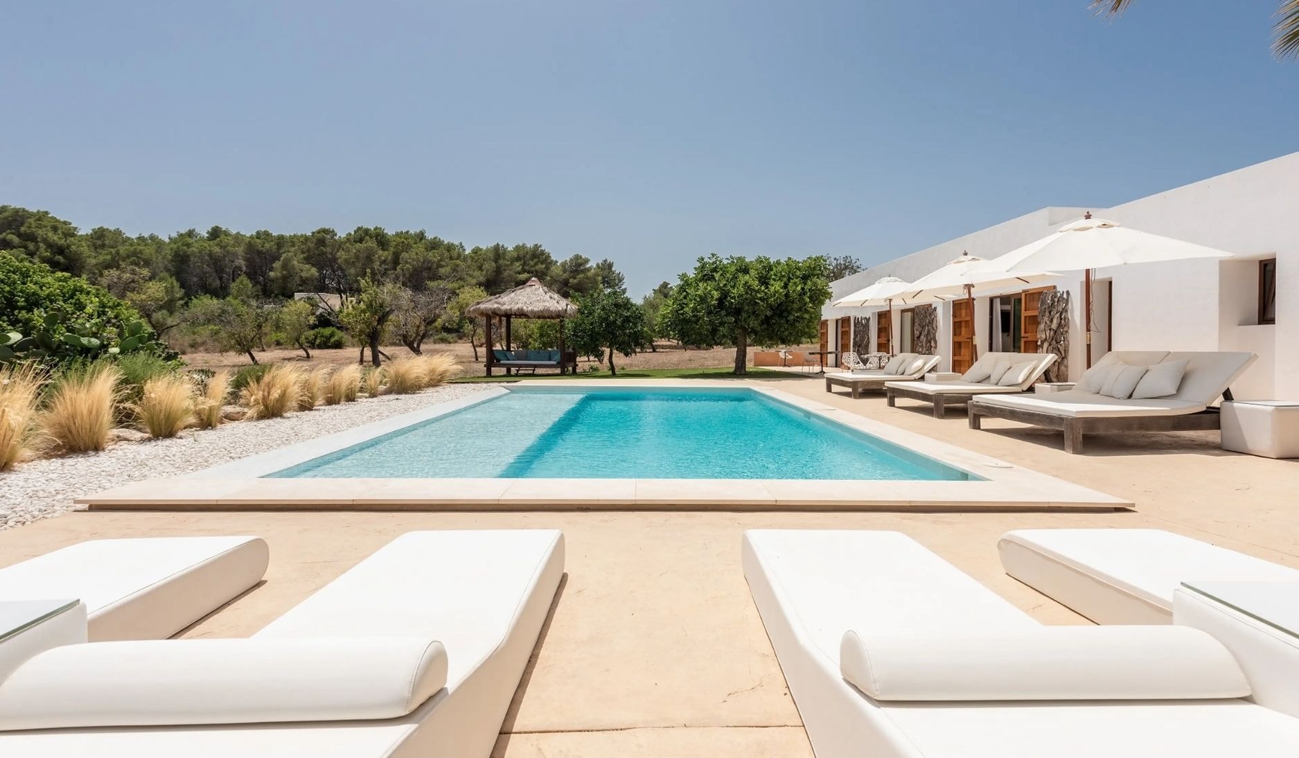 Three additional bathrooms serve the pool area, alongside changing facilities and sports equipment. One room functions as an office space. The property includes modern comforts like air conditioning, satellite TV, and indoor sound systems. Days here might begin with coffee from the Nespresso machine before spreading across the grass gardens, perhaps firing up the barbecue for lunch. Ibiza Town sits 25 minutes away when you fancy a change of scene.